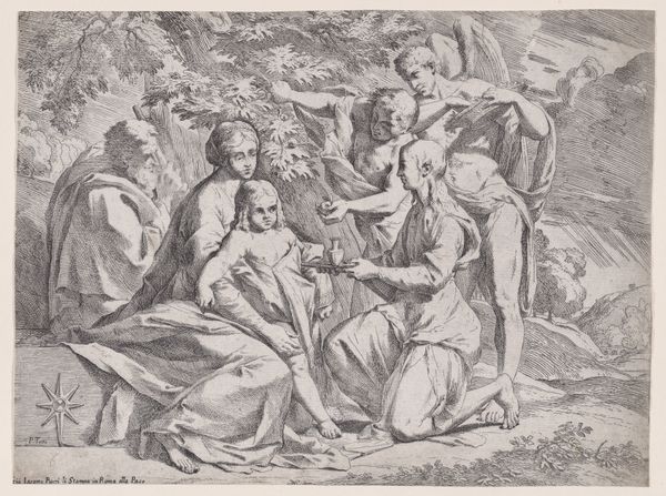 Curator: Paul van Somer II produced this engraving between 1670 and 1697, titled "Moses in the bulrushes," or "Mozes in het biezen mandje" as it is known here at the Rijksmuseum. It depicts a key scene from the Exodus story. Editor: Ah, yes. My initial reaction is pastoral peace, somewhat undermined by a tangible anxiety that the image holds back. Despite the sunny, idyllic rendering, a subtle current of worry flows underneath, right? Curator: Absolutely. Engravings like these from the Baroque period played a crucial role in disseminating biblical stories to a wider audience. The print medium itself—the process of etching, inking, and pressing—allowed for multiples, impacting religious and cultural life. Editor: It's almost paradoxical how this mass-producible medium portrays this uniquely intimate moment. The tenderness in the women’s expressions, juxtaposed with that underlying tension… How fascinating to see Van Somer’s workshop negotiate religious gravitas with widespread consumption! Curator: Exactly. Van Somer has flattened the affect; this adds a strange layer of disconnect to the presentation, I think. Moreover, let's think about who these images are catering to? They are purchased, owned, circulated... Editor: Okay, okay, so for that intended audience the engraving needed to appeal in a way that was comforting, accessible... It's lovely how the baby Moses becomes almost a decorative element within the larger design. Curator: Note also how he brings a very real approach to landscape drawing which may suggest that the narrative is brought into closer contact with a Northern European Protestant viewership that does not generally associate divinity and nature. Editor: You’re right! It definitely softens the blow, if there ever was one. A real comfort food, maybe? Curator: Perhaps. And that is, maybe, its strength. This tension between intimate suffering, private grief, a grand stage in history and mass production, makes "Mozes in het biezen mandje" much more profound. Editor: I like the layers of this, somehow more poignant because of the seeming plainness. A message that, with wider understanding of the material production, continues to echo.