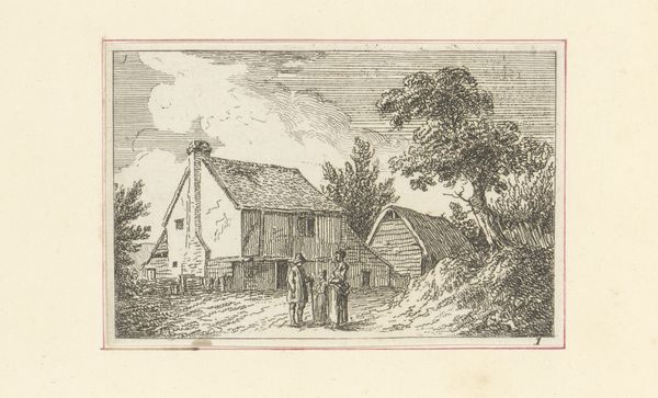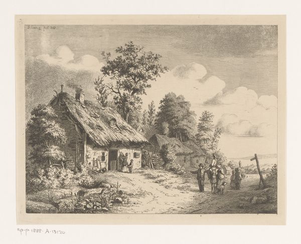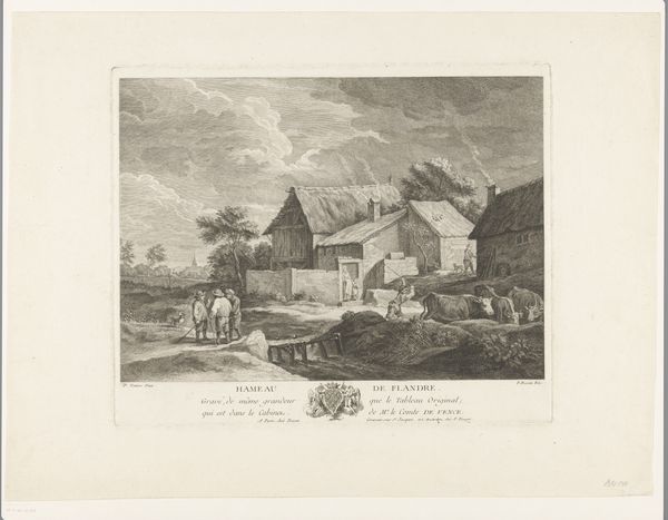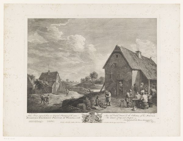 Curator: This print, currently housed at the Rijksmuseum, is entitled "Figures before an Inn along a River." Jacques Philippe Le Bas created it in 1747. Editor: I have to say, I’m instantly drawn to the way the smoke curls out of the chimney, it lends this bucolic scene such a homey, comforting atmosphere, don’t you think? Curator: Absolutely. We need to understand the historical and social context here, though. In 18th-century Europe, scenes like this often romanticized rural life. Consider who could afford art. These idyllic portrayals glossed over the realities of peasant life, perpetuating certain ideals about class and landscape. How do we, as a contemporary audience, navigate that visual narrative? Editor: You know, when I see this, I immediately wonder, what are they talking about? Is it just daily chatter, or something heavier, given the historical setting? There’s so much potential to project narratives onto this scene; it makes you an active participant, not just a passive observer. Curator: Le Bas's "Figures before an Inn along a River" exemplifies a tension: it provides visual pleasure, with detailed engraving work characteristic of the baroque era. However, it can also become a tool of social commentary once we understand the underlying power dynamics related to representations of labor and leisure in the arts. These pieces often obscure the difficult socio-political environment with aesthetic grace. Editor: Hmmm, I do agree that historical awareness is critical. But, the pure craft on display makes me wonder about the sheer skill involved to transform a common social gathering into something worthy of contemplation and consideration hundreds of years later! Perhaps in itself that is a form of resistance. Curator: An interesting consideration. The image encourages me to further investigate how these seemingly simple representations intersect with complex social frameworks of the 18th century. Editor: Well, next time I raise a pint I’ll be sure to make it a bit more pensive then. Thanks for offering me this wider view!