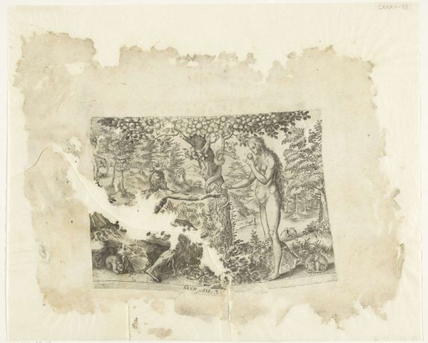 Editor: Here we have a damaged, almost ghostly etching and engraving entitled "Adam and Eve", dating from 1585-1596 by an anonymous artist, currently held in the Rijksmuseum. It’s…fragmentary, obviously, but what remains has this delicate, unsettling quality. How do you interpret this work, especially considering its incompleteness? Curator: The fragmented nature itself becomes a powerful symbol, doesn't it? Consider the Fall—it’s a story of fractured innocence, a shattered paradise. The missing pieces echo the loss inherent in the narrative. Note the deliberate depiction of the serpent coiled around the tree. In iconography, snakes have always been highly symbolic of temptation, deceit, and primordial energy. Editor: So the artist is using these familiar symbols of Adam, Eve and the serpent as signifiers...almost like shorthand for a much bigger idea? Curator: Exactly! And see how Adam hesitantly reaches for the apple offered by Eve? The serpent seems to watch their descent, an ancient premonition that humans continue to contend with in modern society. It serves as a powerful, even cautionary visual, doesn’t it? But how do you respond to Eve taking control, when for centuries, she was positioned as a mere background figure? Editor: I suppose, viewing this now, it complicates the blame assigned to Eve, challenging the typical interpretations of the original story, adding even more layers. Curator: Indeed. This seemingly simple engraving opens a complex dialogue with our understanding of creation, culpability, and cultural memory, don't you think? I have new-found respect for this ancient interpretation! Editor: I completely agree. The damaged nature, combined with the use of powerful symbolism, makes it such a compelling image. Thanks for clarifying it for me!