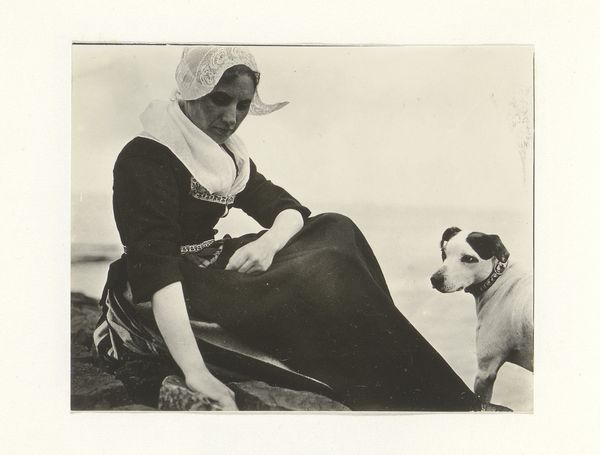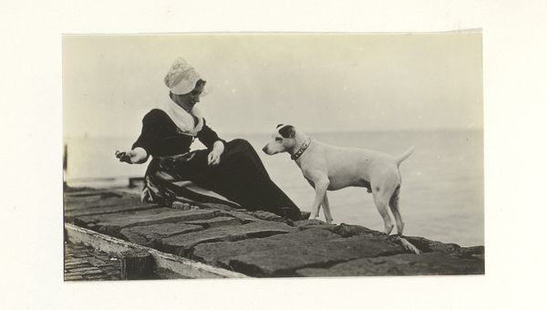 This old photograph, Vrouw in klederdracht met een hond aan een water, by G. Hidderley, captures a woman in traditional dress with a dog, near the water. It's a small image, only 75 mm high, so its intimacy draws you in. The tonal range is very limited, mostly blacks and greys, with very little bright white to give contrast. Look at the dark mass of the woman's skirt, how it anchors the image and contrasts with the lighter sky and the dog, who is looking right at us. The emulsion of the photo seems soft, not super crisp, giving the whole image a dreamlike quality. It feels like the scene is a memory slowly fading over time. There's something about the way the dog's bright coat contrasts with the woman's dark dress that makes me think of the push and pull between tradition and individuality. Like maybe the dog is a stand in for something more wild and untamed. Think of other artists like Eugène Atget, who documented old Paris. Like Atget, Hidderley captures a world that is quickly disappearing. There's always more than one way to see things.