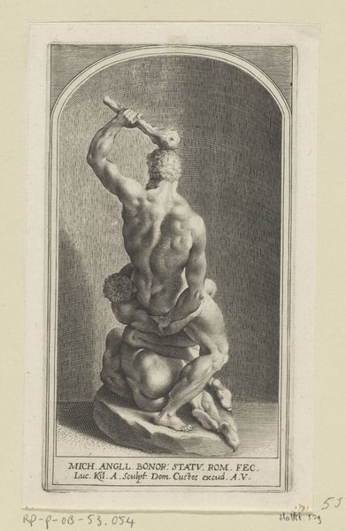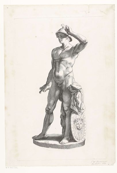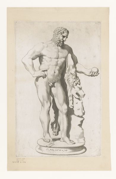 Editor: This drawing, "Statue of a Faun with Cymbals," was made by Claude Mellan between 1671 and 1677. It's done in engraving on paper and currently resides at the Rijksmuseum. There's a restrained energy to the figure; despite its static pose, the poised cymbals hint at imminent sound and movement. What significance do you think cymbals have in a depiction like this? Curator: The cymbals are key. Think about the Faun figure itself. This isn’t just a playful woodland creature; the cymbals elevate him. In classical iconography, cymbals are associated with ecstatic religious rituals, particularly those honoring deities like Dionysus. They signal not just music but altered states, moments of heightened awareness and divine connection. What kind of emotional states do you see the Faun experiencing? Editor: I suppose it's a mix. He seems mischievous but also somewhat solemn, maybe even caught in a moment of reflection before the revelry truly begins? Curator: Exactly. Mellan is tapping into something primal. This drawing engages with collective memory and the continuing human need to express joy, but also the acknowledgement of the transient nature of such experiences, what Carl Jung might call 'archetypal.' How does this interplay affect your appreciation of the artwork? Editor: It makes it feel more profound than just a mythological depiction. The cymbals, in that context, almost become a symbol for the human soul seeking transcendence through sound and ritual. It adds a layer of meaning I hadn't considered initially. Curator: And the lasting resonance of these symbols ensures their continuing vitality, even centuries after their creation. A testament to the power of visual language to express humanity's shared experiences.