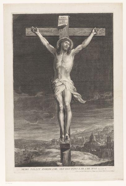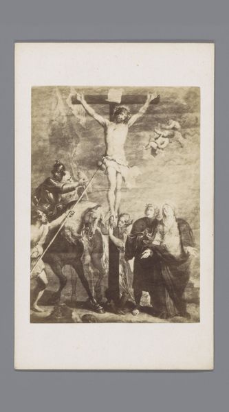 Curator: This stark charcoal drawing is entitled "Christus aan het kruis," or Christ on the Cross, created in 1884 by Carl Bloch. Editor: My immediate feeling is desolation, just utter emptiness. The grayscale amplifies it, and it's as though all color and all hope have been drained from this landscape. Curator: The image certainly speaks of finality. Let’s consider Bloch’s choice of charcoal, a relatively simple medium, to depict such a profound scene. He couples it with printmaking, an unusual medium, given it’s considered religious iconography. What are your thoughts about the technical and societal relevance? Editor: The labor intensiveness interests me here. Printmaking and the detail offered by charcoal involve preparation, technique. These processes involve collaboration: charcoal production and distribution; engraving the print itself. Where does it originate, where does it circulate, and how affordable would a print like this have been? Curator: That’s a potent reading. I can imagine copies reproduced and widely available. But there’s a paradox isn't there? The artwork's very replicability diffuses its emotional intensity. This version becomes one of many rather than the defining, iconic moment. I keep being drawn to the quiet individuals grouped around the cross base as witnesses of profound emotional significance and enduring impact on civilisation. Editor: Exactly! And look at how Bloch captures their mourning using relatively crude yet deeply expressive strokes, so much can be revealed in just charcoal or via etching. And of course the symbolic resonance is potent because that's where raw emotion meets organized religion and economy in society. I think looking at what materials he had access to can inform us just as well as biblical context. Curator: True. These choices underscore how earthly, or materially anchored, the depicted suffering truly is. By reminding us of labor, commerce, of our own mortality in many ways. Editor: I feel, at the end of our conversation, I know a bit more about Bloch and his own views, not only what a crucifixion meant at the time and its impact on individuals, but to see it in more modern terms—where did those art materials originate and what were their effects at the time! Curator: Indeed. Perhaps it allows us a modern viewpoint to consider the interplay between divinity, material realities, and personal response, offering a space to meditate about art.