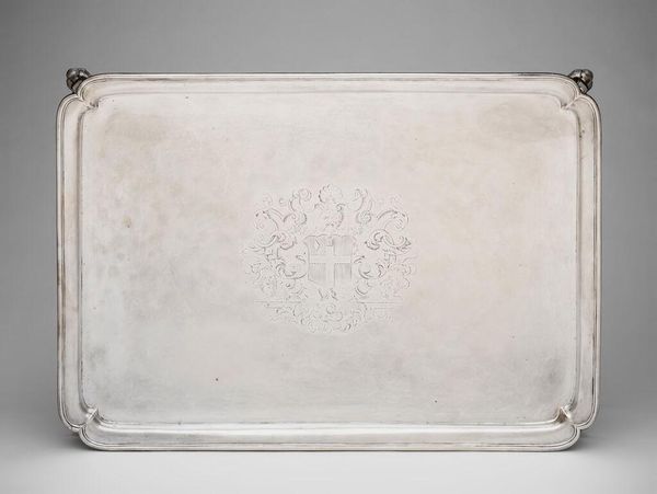 Editor: This silver tray, by John Rand, features an engraved emblem. It feels both simple and stately. What symbols jump out to you? Curator: The emblem is fascinating! Coats of arms, like this one, were once potent symbols of lineage and status. Do you notice the rooster at the top? It is a symbol of vigilance, courage, and often, resurrection. Editor: Resurrection? That's unexpected on a tray. Curator: Precisely! It reminds us that even everyday objects can carry layers of complex cultural meaning. Objects like these connect us to the past. Editor: I’ll never look at a silver tray the same way again.