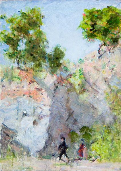 Editor: This is Denman Waldo Ross’s “The Hallowell House, South Yarmouth, Massachusetts.” It's hard to pin down a date for it. The colors are so dreamy; a lilac house, against this vibrant orange foreground. What kind of symbolism do you see in it? Curator: Note how the house is partially obscured by foliage, suggesting nature's reclaiming power over domestic spaces. The vibrant colors evoke a sense of nostalgia, perhaps reflecting a yearning for simpler, more harmonious times. What emotions do the colors evoke in you? Editor: Definitely warmth and maybe a bit of longing. It's interesting how a simple color palette can speak volumes about memory and place. Curator: Exactly. The artist uses those visual cues to invite us to engage with our own memories and cultural heritage. It encourages us to think about how spaces shape our identities. Editor: It’s incredible how much an image can hold. Thanks for sharing your insights. Curator: My pleasure. It's through these dialogues that we unlock the enduring power of art.