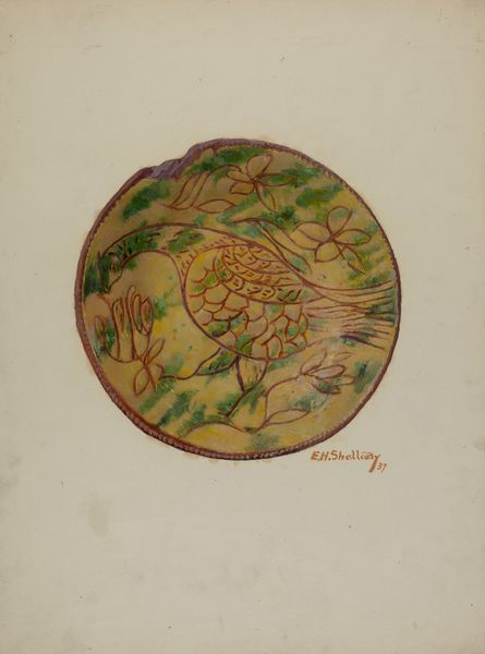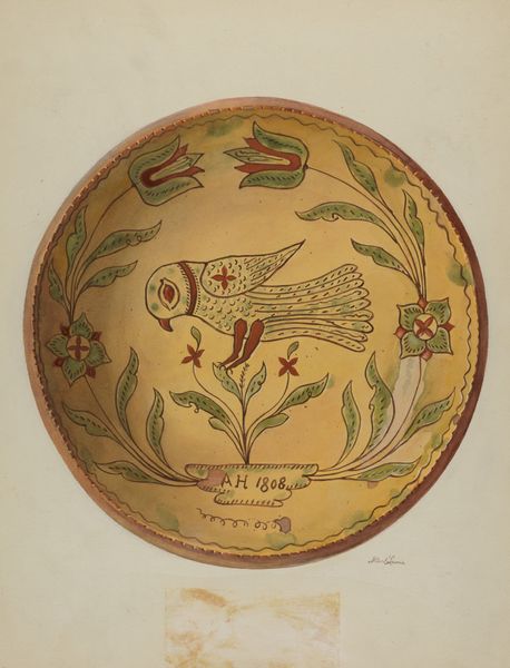 This ‘Pa. German Plate’ was rendered in watercolor by Eugene Shellady. It's got this home-spun, folk art vibe that I find really charming. The colors, ochre, green, and sienna, are muted. The paint is laid down in simple washes, and the lines are casual, a bit wobbly. There’s no real attempt to hide the hand, you know? Like, this isn't about slickness or illusionism. Look at the bird, perched on a leafy sprig. It's got this real, almost awkward grace to it. The whole thing is just so direct, so unpretentious. The border is a sequence of marks, dashes, dots and circles. There’s something in the way the artist has approached the outer rim of the plate, dividing it into segments of almost equal length which make it feel so deliberate. I’m reminded a little of Forrest Bess, who also had this amazing way of making paintings that felt both deeply personal and totally universal. Anyway, it's a reminder that art doesn't have to be perfect to be powerful.