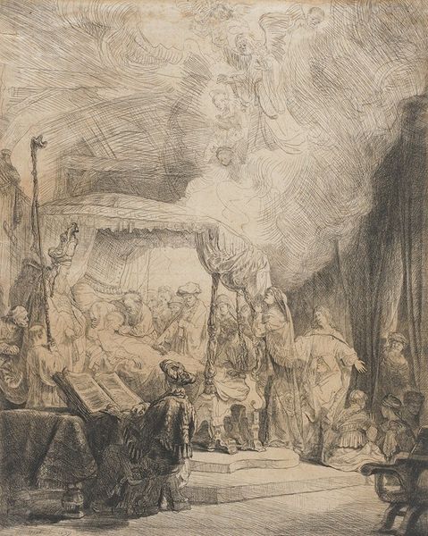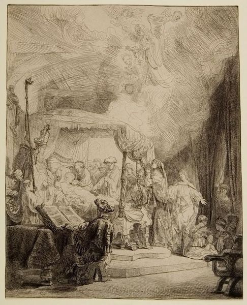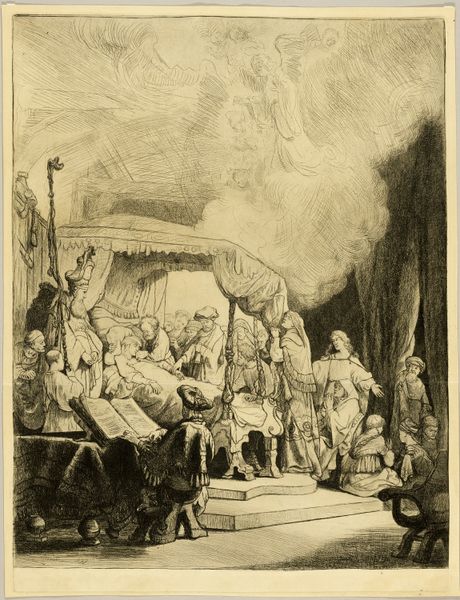 Editor: Here we have Rembrandt van Rijn's "The Death of the Virgin," an etching and drypoint from 1639. It's striking how Rembrandt captured such a somber moment with incredible detail. What strikes you most about this piece? Curator: It's fascinating how Rembrandt used printmaking to engage with profoundly emotional narratives. Consider the role of the Catholic Church and wealthy patrons in commissioning these dramatic scenes. What statement was Rembrandt, a Protestant artist, making by depicting such a central Catholic subject? Editor: That's a perspective I hadn't considered. The composition seems theatrical, almost staged. Curator: Exactly! The Baroque style flourished under the gaze of powerful institutions. Reflect on how artistic choices like dramatic lighting and intense emotional expression served the Church's agenda. Does Rembrandt subvert or comply with this tradition in his print? Editor: I see the tension now. There's a realism in the figures' grief that feels very human and raw, yet the heavenly figures feel idealized and remote. Was Rembrandt commenting on the Church's representation of these events? Curator: Precisely. His use of etching and drypoint allowed for incredible detail, enabling him to render these figures with a mix of vulnerability and theatricality, thus fueling discourse on the period's social and religious climate. It’s an example of how art becomes a site of cultural negotiation. Editor: That's incredibly insightful. It's much more than just a depiction of a biblical scene. Curator: Absolutely. Rembrandt's "Death of the Virgin" encapsulates how art exists within and actively shapes historical discourse. Looking at it with that in mind enriches our understanding. Editor: This really opens up a whole new dimension for appreciating Rembrandt's work!