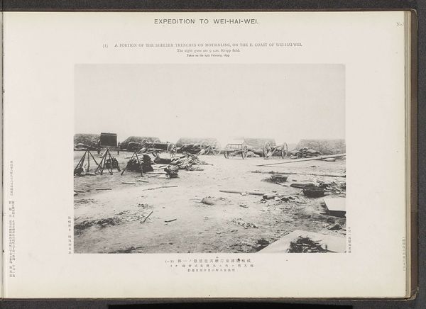Editor: So, here we have what looks like a photograph – "A general view of the Lungmeaoutsuy fort, on the E. coast of Wei-Hai-Wei, destroyed by the Japanese army." Probably taken around 1895. It's pretty stark, a ruinous landscape… very heavy, somehow. What catches your eye? Curator: It's true; devastation can be rather heavy. The image almost breathes with loss. You know, it reminds me a little of those 19th-century photographs of ancient ruins, a kind of 'picturesque decay' meets geopolitics. What stories do you imagine lie beneath those stones, Editor? Editor: Definitely stories of conflict and change. I mean, you see the fort, or what's left of it, against this vast, empty space. What’s interesting to me is this depiction as 'history painting' -- How do we make sense of destruction? Is it beautiful, or is it cautionary? Curator: Both, perhaps. We, as humans, always attempt to take broken, dissonant realities and construct some meaning within. But does this image evoke a sense of 'Orientalism' for you, and if so, is it a superficial "style" or an important reflection of global dynamics in the late 19th century? What nuances exist between those concepts? Editor: Well, the title itself points to a Western gaze on this particular moment in East Asian history. Maybe Orientalism seeps into the image by how the scene's presented—almost like a trophy of war. It makes me question who this photo was really for. Curator: Exactly. Photographs weren't just neutral records, they were often instruments of power. Seeing that interplay helps us recognize how the "real" world is always being subtly sculpted and framed. It encourages us to ask “Why this and not that?” “For whom, and what do they seek?” Editor: It really does reframe how I look at historical images. There's a lot more going on beyond just the surface. Curator: Absolutely. It's not just a picture of ruins; it's a relic itself, loaded with perspectives, agendas, and maybe a few uncomfortable truths.