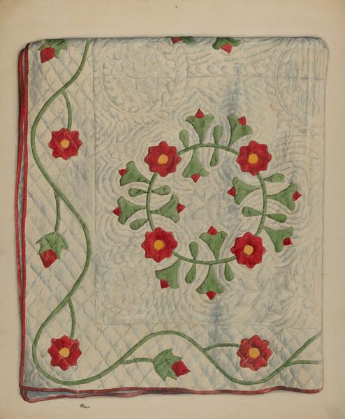 Editor: So, here we have Madeline Arnold’s "Applique Quilt" from around 1936, rendered with drawing and watercolor. There's a striking yet subdued quality to the piece, particularly in the repetitive floral design. What jumps out at you? Curator: I'm drawn to the labor embedded within. While presented as a drawing, its title points directly to the domestic craft of quilting. The meticulous detail, replicating the stitched texture and floral pattern, speaks to the artist’s awareness of material processes and the social context of "women’s work." Think about the materials, typically textiles; how does transforming them into a watercolor shift our perception of value and artistry? Editor: That's fascinating. I hadn’t considered the shift in medium itself as a commentary. So, by depicting a quilt – traditionally ‘craft’ – in watercolour, is she elevating its status? Or questioning the separation of fine art from the everyday? Curator: Precisely! It blurs those boundaries. What about the intended function of a quilt versus this static representation? Quilts provide warmth, comfort, and are often imbued with personal stories and familial connections. What happens when this utility is removed, and we are left with an image? How might its meaning change in the domestic versus a gallery setting? Consider too how materials shape cultural value judgments; think the cost of production and consumption within a socio-economic framework. Editor: I see. So the work prompts questions about production, value, and even the role of art in reflecting and shaping our understanding of labor and domestic life? Curator: Exactly! It’s not merely a pretty floral design. It encourages us to think critically about the hierarchies inherent in art and craft, and the social implications of the materials and processes involved. Editor: This really shifts my perspective; it is much more than a simple design, it’s loaded with social commentary about the value of craft and labor. Curator: Indeed. It's about questioning the systems of value we often take for granted.