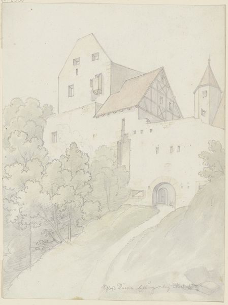 Curator: Here we have Karl Ballenberger's "Innenhof der Burg Colmberg," a watercolor and ink drawing currently housed here at the Städel Museum. Editor: It's funny, it gives off this immediate impression of hushed secrets and untold stories, like a stage set for a ghostly play. The almost monotone washes feel both historical and melancholic. Curator: The materiality contributes, wouldn't you agree? The combined use of watercolor, ink, and pencil on paper allows for a layering that's key to depicting architectural detail. Consider how Ballenberger emphasizes the stones, the roofs; each structural component given texture. Editor: Yes, texture is paramount. Look how he's delineated the wear and tear, the tiny dramas etched on every brick. I almost feel I can hear the echoes in the courtyard, but I would also like to know more about how accessible, physically or economically, paper, colored pencils and indian ink were to the artist in that time, and whether that might impact what he choses to focus on within this scene. It seems like luxury but could actually be all that was at hand! Curator: Good point. Understanding what was at the artist’s disposal impacts any art interpretation. If paper wasn't commonplace, his focus on architectural facades might speak volumes about his engagement with civic society versus pastoral romanticism, for instance. Editor: It invites a broader conversation around what gets deemed worthy of art, particularly within realistic depictions of buildings versus portraits of power. It makes me wonder how that system influenced this Burg Colmberg and how buildings in that period reinforced class distinctions or other such things. What's his relationship to this space? Was this commissioned? Did he have free range? That would determine his subject matter! Curator: Exactly. Such buildings symbolize control. In essence, even seemingly passive scenes conceal complex labor processes of construction and maintenance – stories hidden within plain sight. Editor: Food for thought for me, and for anyone wandering around it! This place seems less like a pretty view than a witness of life as lived, and labour as endured, really. Curator: Agreed; materiality unveils narratives far beyond surface beauty.