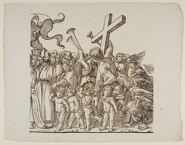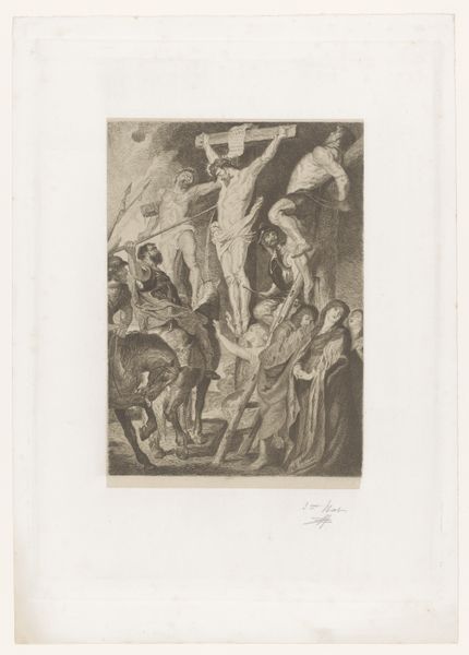 Editor: This print, “An Abbot-Saint Restoring a Blind Man’s Sight,” is by A. Claude Philippe de Thubières comte de Caylus. It really strikes me as a commentary on power, with the Abbot-Saint centrally positioned. What do you see in this piece? Curator: It's interesting you see it that way. I see it as a study of social dynamics and the ways in which art can reflect and reinforce hierarchies. Who gets to see, who gets to heal, and who gets remembered? Consider the composition; it centers the Abbot-Saint as an almost divinely appointed figure, but what about the blind man and his community? How are they represented, and what does that tell us about the artist's own social positioning and intentions? Editor: That makes me think about the gaze – who holds it and who is subjected to it in the artwork. Thanks! Curator: Exactly! By questioning the representation of power and disability, we can better understand the print’s message and its role within broader conversations about privilege.