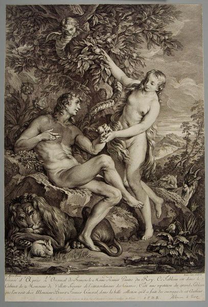 Editor: Laurent Cars' print, "Time Rescuing Truth," presents a dynamic scene. The strong diagonals and dramatic figures give it a real sense of movement. How do you approach the composition of this piece? Curator: Indeed, the dynamism is key. Observe how the artist masterfully employs line and form to create a visual hierarchy. The swirling drapery and the figures' poses direct the eye upward, culminating in Truth's triumphant ascension. Consider also how the chiaroscuro enhances the drama, lending weight to the figures and emphasizing the stark contrast between virtue and deceit. What is your interpretation of Time's stance? Editor: He seems determined, almost burdened, by his task. I hadn't considered the light and shadow creating a virtuous and deceitful dichotomy. Thanks! Curator: Precisely. By focusing on the interplay of these elements, we gain insight into the artist's intent and the underlying narrative structure.