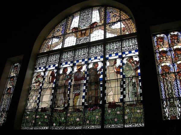 Editor: This is "Loughrea St. Brendan's Cathedral. Nativity in Nine Scenes" designed in 1908 by Sarah Purser, created with stained glass and integrated into the architecture. I'm struck by the intricate, almost graphic style, like a comic rendered in glass. What are your thoughts on this window's construction? Curator: Observe how the structure of the stained glass inherently segments the narrative. Each scene is meticulously contained, almost as individual units. Note how the lead lines act as both structural support and bold outlines, dictating the viewer’s eye and creating a distinct visual rhythm. The intense colours – the saturated reds and blues – also work to differentiate each scene. What do you notice about the arrangement of these colours and forms? Editor: Well, the vibrant colours create a hierarchy, drawing your eye to specific figures or actions within each panel, adding layers to the story. It is clear Purser chose specific tones that enhance readability. It feels considered and purposeful, in service of a narrative. Do you think it leans more toward its medieval influences, or pushes in a more modern direction? Curator: That is precisely the point! By analyzing the relationship between the color choices, leading, and compositional arrangement, one can see it strikes a calculated balance. Note the clear Gothic revival style. Look at the structural lines, balanced figuration and vivid colors, reminiscent of High Medieval and Early Renaissance altarpieces, updated in an early 20th-century sensibility. The deliberate juxtaposition and structuring is thought provoking. Editor: Absolutely. I see what you mean about the thoughtful layout enhancing the narrative. It all comes down to how the elements relate to one another. Curator: Precisely, each element, thoughtfully combined to engage with visual language. A window not just to see through, but to decipher.
