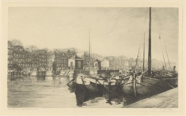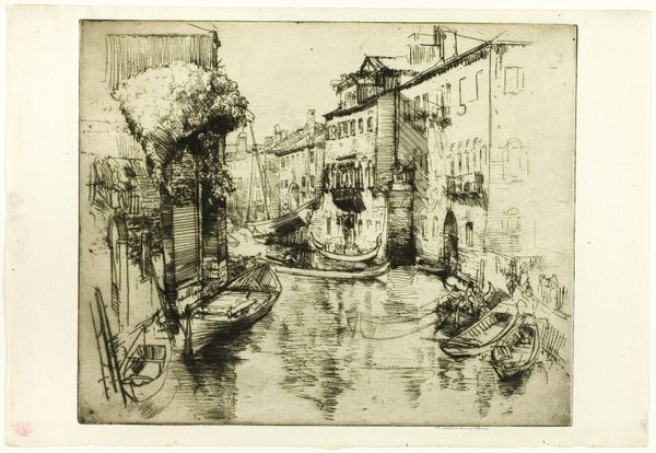 Editor: Here we have Donald Shaw MacLaughlan's "The Market, Venice," created in 1908. It's an etching, printed on paper. It looks quite busy, full of details… a very bustling scene. What do you see in this piece, from your perspective? Curator: This etching immediately draws my attention to its process. The labor involved in creating such intricate lines using the etching technique! And consider the socio-economic context: Venice, as a major trading hub. The market isn't just a scene; it's a representation of consumption, of a whole economic system visualized. How does the artist depict the vendors? Are they romanticized, or does he depict the reality of labor? Editor: That’s interesting, I hadn't thought about the labor involved so directly. I was mostly focusing on the architectural details and the gondolas. So, the medium itself—etching—connects to themes of labor in the subject matter? Curator: Precisely. Think about the acid used, the painstaking work of applying the ground, drawing, and biting the plate. It’s a laborious process mirrored in the market scene itself. What materials are being traded, who controls them and profits from the exchange? The print, multiplied and circulated, can be regarded as merchandise itself, accessible for a wider consumer base than, for example, an oil painting. Does that influence your thinking about the print medium? Editor: Absolutely. Thinking about it as a commodity shifts my understanding completely. I guess I hadn’t considered the materiality of the print itself as being linked to the marketplace it depicts. Thank you! Curator: My pleasure! Considering these prints as both art objects and products certainly offers a different lens through which to view them.