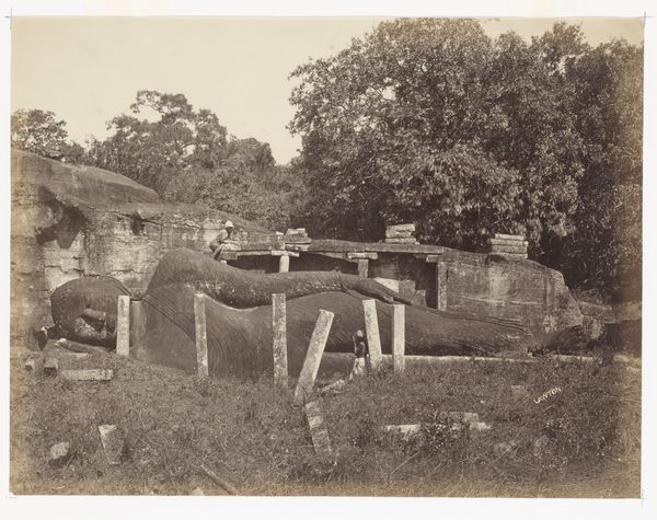 Editor: This photograph, "South East Angle of the Tirambur Pagoda," was taken by Linnaeus Tripe in 1858. It's really struck me, I think the contrast between the ancient walls of the pagoda and the scrubby, almost resilient nature around it is incredibly compelling. What do you see in this image? Curator: I'm immediately drawn to how Tripe captures a sense of timelessness. Notice the imposing structure, how the pagoda itself seems to embody permanence and power. But look closer – there’s life sprouting from its ramparts, those trees clinging to the stone. They become symbols of resilience, suggesting life's tenacity against the backdrop of human construction. Does the presence of foliage reveal humanity or nature's enduring dominion? Editor: That’s interesting. I hadn't considered the symbolism so much. I was mostly reacting to the way it looks. So you see those trees as representative of the relationship between humanity and nature? Curator: Precisely. The photographer chose to represent a specific time, revealing its architecture in correlation with nature, in which the photographer seems to remind the audience the importance of cultural preservation and that human construction is vulnerable to the effects of time, just like human life, yet can be beautiful when presented harmoniously. Do you observe this element? Editor: Absolutely, now that you point it out. It gives the photograph another layer. Maybe it’s about appreciating the present moment and the stories held within both natural and built environments? Curator: Exactly! This dialogue with the past and nature highlights the inherent connection and inevitable cycle of decay and rebirth inherent to cultural memory. Photography then can be both about documentation, and about using those records to explore those psychological and anthropological intersections across eras and civilizations. Editor: That’s a really powerful way to think about it. I'm definitely seeing so much more now. Thanks! Curator: Indeed, a worthwhile exploration, revisiting how images echo symbols that outlast their original moment.