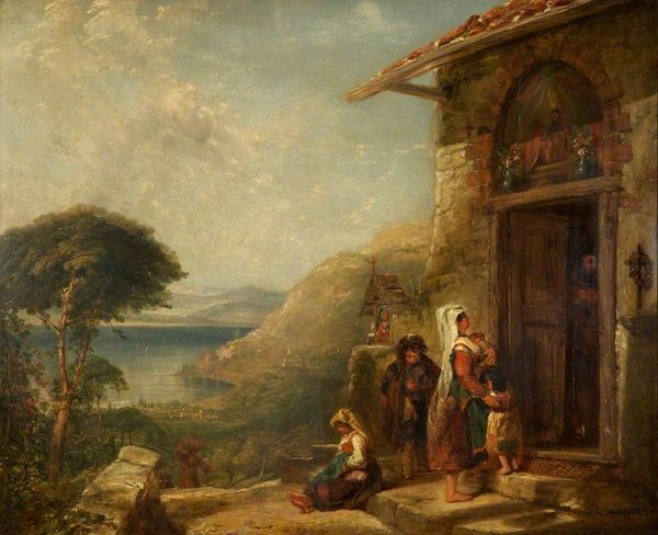Curator: Before us hangs William Collins's "The Stray Kitten," an oil painting rendered around 1835. The landscape unfurls as a vignette of rural life. Editor: Gosh, that title. The painting has this overall amber glow to it, which makes everything seem kinda sepia-toned, doesn't it? Like an old photo about to crumble. Melancholy tints for something with kittens, that’s saying something. Curator: Notice the spatial arrangement. The composition relies on a strong contrast between light and shadow, with a central clearing drawing the eye towards the eponymous kitten. The figures, positioned around this focal point, create a balanced but dynamic tableau. The formal strategies situate genre painting into grand themes through color saturation. Editor: True. I also note all the gazes drawing attention to it too; those kids clustered near the fence are pointing it out! You know, this whole scene kind of gives off the feeling of those perfect, idealized memories. Is that what this moment captured for the artist? The fleeting charm, the simplicity? It feels nostalgic, even for something I didn't live through. Curator: The Romanticism inherent presents itself via that sublime treatment of landscape as backgrounded space; and realism operates within rendering textures—the rough fence, the children's garments, and, of course, the delicate fur of the kitten itself. There's a tactile quality, almost a hyperrealism, in those details that commands attention. Editor: Collins definitely had skill – I can smell the cut grass, can almost hear children chattering, and even imagine that a cat hiss! Also, I suspect he had a warmness and fondness for all things "small", like, you know, those quiet moments and everyday charms, right? What's more simple and full of potential than a little creature up for adoption. Curator: An astute summation of Collins' artistic choices, Editor. Editor: That cat does get ya in the heartstrings... Thanks for walking me through this gem.