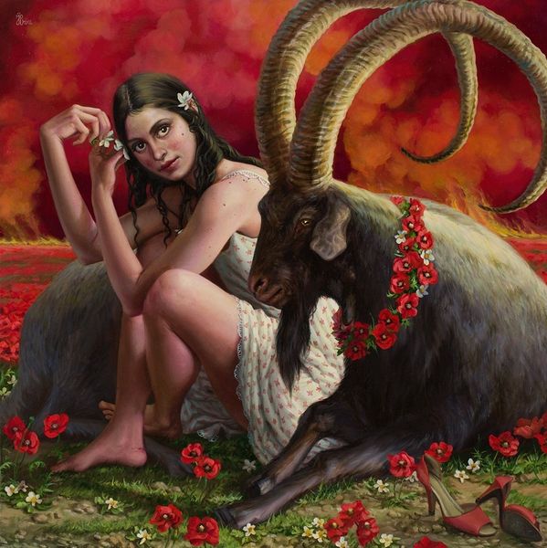 Julie Bell’s painting, titled "Rhiannon," evokes an ethereal encounter with a figure from Welsh mythology. Bell, who is well-known for her fantasy and figurative art, often explores themes of female empowerment and mythological narratives. Here, Rhiannon is depicted as a beautiful woman with flowing hair, clad in a red dress that billows behind her. She gestures towards a foal with an otherworldly appearance, its form seemingly caught between the mortal and magical realms. The choice to depict Rhiannon in a state of transit, invites us to consider the fluidity of identity and existence. Bell reimagines the story of Rhiannon, infusing her with a sense of dynamism and mystery. The painting is more than just an illustration of a myth, it is an exploration of female agency and the enduring power of storytelling. It is a moment of connection, of revelation, as Rhiannon seems to beckon us into her world.