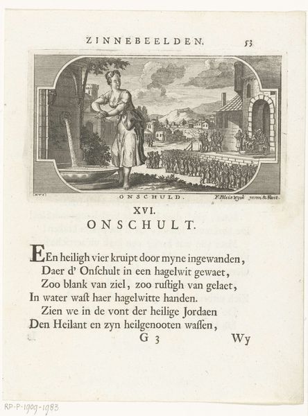 Editor: This engraving, “Embleem met allegorie op wijsheid” or “Emblem with Allegory on Wisdom” by François van Bleyswijck, dating from 1681 to 1737, presents a figure in a circular frame. I’m immediately drawn to the contrast between the dark lines of the engraving and the radiating light emanating from the lamp. What kind of significance would this image have held for viewers at the time it was made? Curator: That light, first, immediately references wisdom, a beacon cutting through the darkness of ignorance. The lamp, prominently held, links to the classical personification of Wisdom, often associated with Minerva, the Roman goddess whose Greek counterpart, Athena, traditionally is depicted with an owl on her shoulder as it also occurs here in the bottom right, another symbolic echo representing knowledge and insightful vision, connecting back to cultural memory and learned societies of that period. Editor: So the lamp and the owl serve as explicit symbols… Were emblems like this intended to carry moral weight or a specific message? Curator: Absolutely. These emblems were enormously popular and served as visual mnemonics, reinforcing cultural values and offering moral guidance. The book in her other hand reinforces that knowledge. It serves as an encouragement to be steadfast, just as it is written below it: "The book, which it exhibits so grandly, that is the book of books". The continuous burning of the lamp becomes a visual representation of knowledge's permanence when fueled by diligent effort. Is there a feeling that this imagery presents itself outside of its time? Editor: No, it feels very much of its time. The overt symbolism and moralizing definitely speak to that era. The way classical imagery is merged with contemporary values is pretty fascinating though! Curator: Exactly! It highlights how societies consistently adapt and re-interpret older symbols to align with contemporary ideologies and aspirations. Editor: It’s been very enlightening (no pun intended!). I'll definitely pay closer attention to recurring symbols in other artworks. Curator: A new way of thinking about the use of symbolism over time should certainly prove to be invaluable as you further explore more and varied art forms.