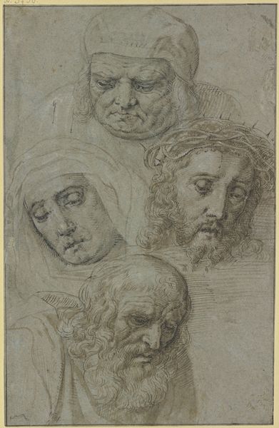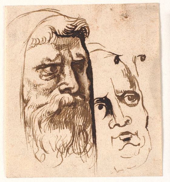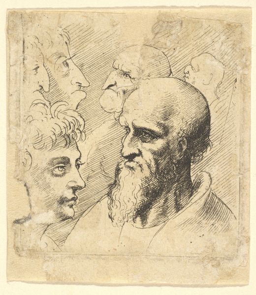 This drawing, "Three Male Heads," was created by Baccio Bandinelli, using pen and brown ink. The composition is dominated by three overlapping heads, each rendered with a distinct expression and angle, creating a sense of dynamic movement. The artist's use of line is particularly striking; notice the tightly packed, rhythmic hatching that models the forms and creates a rich surface texture. The arrangement of the heads is not merely decorative; it suggests a deeper exploration of perspective and the multifaceted nature of identity. Bandinelli uses the repetition of the head motif as a structural device to investigate different viewpoints. The varying perspectives challenge our perception of a single, fixed representation. Consider how the use of line and form in "Three Male Heads" transcends mere representation. The piece becomes an intellectual exercise, prompting viewers to question the stability of appearance and the possibility of capturing a singular truth. Bandinelli invites us to engage with art as a dynamic site of inquiry.