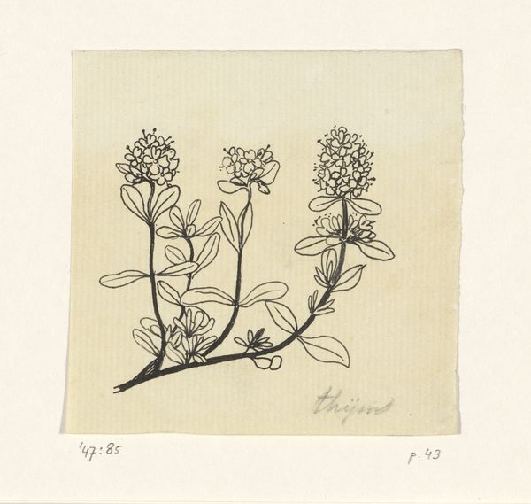 Curator: This linocut print is called "Cyclamen" created around 1920 by Julie de Graag. You can find it here at the Rijksmuseum. Editor: Oh, isn't that just lovely? It's so simple, almost stark, yet somehow incredibly comforting. The flower looks like it's whispering secrets. Curator: De Graag's work sits interestingly at the intersection of art nouveau's flowing organic lines and a budding modern sensibility towards simplification and the graphic arts. This print, in particular, showcases her unique mastery of the linocut technique. It is intriguing, especially when considering that as a woman artist at this time, access to some art world structures would have been very limited. Editor: You know, I find that notion very evocative when viewing the image, as those heavy lines of the linocut also feel like restrictions, yet the delicate flower pushes through, a vibrant affirmation. It almost feels like an act of artistic resistance in such a minimalist framework. Curator: I agree. The constraints she faced certainly play into the choices she made, perhaps forcing her to find power in the most fundamental forms. Note how she contrasts this seeming simplicity with intricate line work, almost mimicking the delicate veins of a leaf. Her engagement of art and commerce is noteworthy; she created drawings, woodcuts, and textile designs and included flora, fauna, and landscapes that invite viewers to reflect on the early twentieth-century relationship to a rapidly changing environment. Editor: Yes, it's subtle, like a quiet rebellion blooming in your windowsill. I'm also drawn to the palette. It's so muted, earthy. I can almost smell the damp soil. Do you think she purposefully evoked those sensations through such restrained colour choices? It’s interesting how so little detail gives so much context. Curator: Most definitely, the conscious constraints on palette speak volumes, I think it speaks to the relationship between nature and urban settings and suggests the possibilities to discover beauty in everything even against a backdrop of the city. Editor: Looking at it makes me want to get my hands dirty and try some of that linocut magic myself! Curator: Perhaps, it can teach us a lesson about turning restrictions into unique strengths. Editor: Absolutely. And about the resilience that flowers share with those of us forging creative paths.