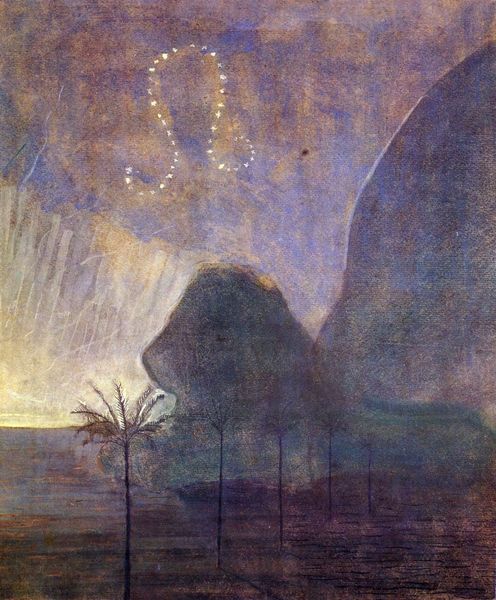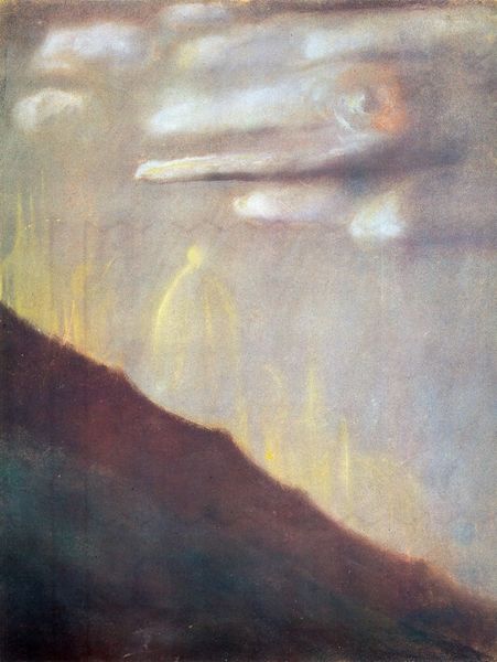 Mikalojus Konstantinas Ciurlionis painted "Andante (Sonata of the Sea)" using mixed media on canvas. Notice the painting's layered composition: at the top, a stylized seascape rendered in muted yellows and purples, contrasted by the sharp lines of a sailboat held within a large, ghostly hand. The hand seems to emerge from a dreamlike landscape of buildings and ships. Ciurlionis masterfully uses vertical lines to connect these disparate elements, merging the earthly with the ethereal. The structure may represent a semiotic system, where the sailboat and hand serve as signs pointing to broader cultural codes. This approach challenges fixed meanings, instead engaging with new ways of thinking about perception and representation. The dreamlike quality of the work prompts us to consider how Ciurlionis uses form not just aesthetically, but as part of a larger philosophical discourse. Through its visual structure, the painting invites ongoing interpretation, reflecting how art can destabilize established values and suggest new ways of seeing the world.