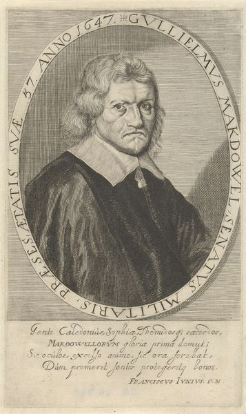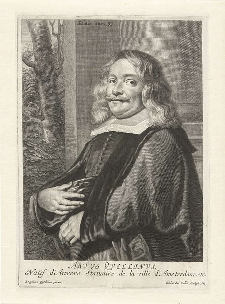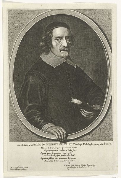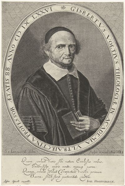 Curator: Immediately I'm struck by this sort of muted drama. It’s an engraving of a clergyman, Laurentius Homma. The piece dates roughly between 1661 and 1673 and exudes a very… contemplative air. What’s your initial response? Editor: Well, I see a certain tension between Homma’s presentation and the social norms of his time. We’re looking at an era defined by rigid religious doctrines. His expression isn’t wholly obedient. His eyes hint at a certain self-awareness, even…challenge? Curator: I find myself drawn to his hands. He holds this book, open, but his fingers seem to dance more than direct. It's like he’s releasing thoughts into the world rather than pinning them down. There’s something deeply sensual about them! Editor: Those hands—they present a compelling dichotomy. The clergy are, by definition, learned but they also often played a central role in suppressing knowledge perceived as subversive. It raises questions about what is being "opened" versus what is being deliberately veiled or manipulated. Is he guiding us or controlling us? Curator: It's precisely this sort of nuance that makes this portrait so captivating. It almost doesn’t fit in its era—with its sober tones and simple shapes! But isn't there always that quiet subversion percolating under the surface? Editor: Absolutely. The inscription at the bottom is in Dutch, another element that connects it deeply with the cultural milieu of its time. It's not just a portrait; it's a layered artifact offering a snapshot into the complex tapestry of 17th-century Dutch society, its politics, and its evolving relationship with religious power. Curator: He certainly prompts me to re-imagine the internal struggles he must have faced, living in such a rigid world. Editor: Exactly, it urges me to ask what the implications of this figure are—especially in relation to the ways that power dynamics have been visually encoded and perpetuated throughout history.
