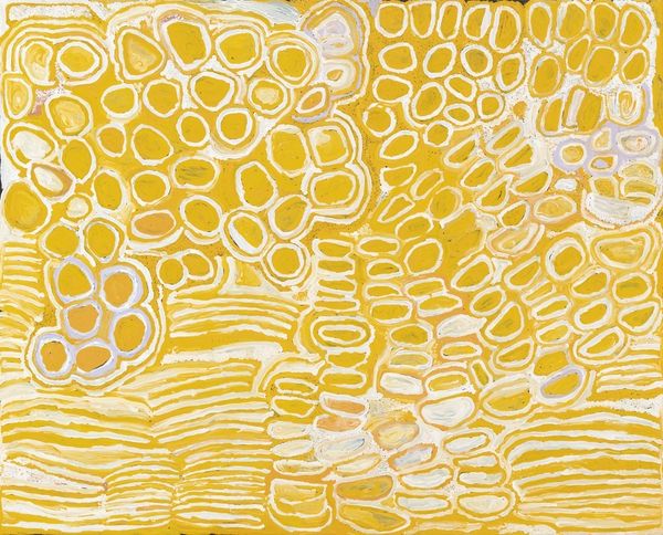 Makinti Napanangka made this untitled painting with acrylic on linen. I love how the ochre and yellow hues create a sense of warmth, like gazing at a sun-soaked landscape through sheer curtains. The horizontal lines of varying thicknesses give the impression of movement, each stroke a testament to the artist's hand. It’s like following a rhythm, each line a note in a visual song. You can almost feel the texture of the paint, the gentle ridges and valleys creating a tactile experience for the eyes. Look at the lower left, where the yellows deepen, contrasting with the softer, almost pastel tones above, creating a visual depth that pulls you in. Napanangka's work reminds me of Agnes Martin's quiet grids, but with a raw, earthy energy. Both artists share a love for repetition and simplicity, but Napanangka’s touch feels wilder, more grounded in the natural world. In the end, it’s the painting's openness that really grabs me, it invites you to bring your own feelings.