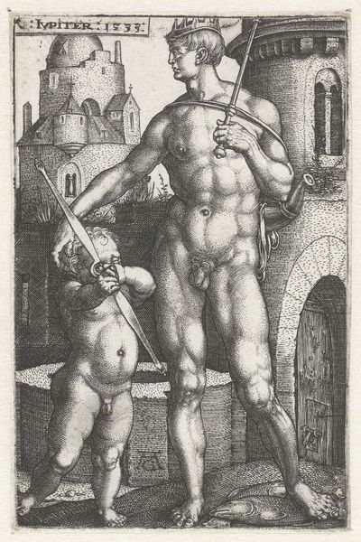 Editor: Georg Pencz’s engraving, "Tamiris, from Greek Heroines," created around 1539, presents a rather unsettling scene. The crisp lines and stark contrast amplify the drama of the moment, and I am struck by the… directness, I suppose, of its depiction of power. What do you see in this piece, especially regarding how Pencz uses imagery to tell a story? Curator: This engraving powerfully illustrates the intersection of myth, gender, and power. Tamiris, or Tomyris, Queen of the Massagetae, is depicted here enacting revenge upon Cyrus the Great. But notice how Pencz, though working in 16th-century Germany, evokes classical imagery. Consider the way Tamiris is semi-nude, adorned with only a crown - it connects her visually to idealized representations of antiquity and reinforces a sense of timeless authority. Do you think this allusion to classical forms enhances or detracts from the brutal act depicted? Editor: It adds a layer, definitely. By referencing that visual language of power and heroism, it almost… legitimizes her violence within a certain historical context. Like it’s not just brutality, but justified retribution. Curator: Exactly. The severed head of Cyrus, presented to her, isn’t just a trophy but a symbol. Pencz employs a visual shorthand, drawing on pre-existing cultural associations. The act itself becomes part of a longer dialogue about leadership, justice, and the cyclical nature of violence across cultures. Think about what this image may have signified for the audience encountering it in the 16th century and what that act meant for that society, or how it’s represented now. Editor: So, it’s not just an image of violence, it's an image loaded with historical, cultural, and even psychological weight, prompting the viewer to unpack the meaning of revenge and justice. That's powerful. Curator: Precisely. And it’s a testament to how artists can imbue seemingly straightforward depictions with complex symbolic narratives that continue to resonate across centuries. We see continuities in those narrative structures about honor and dishonor in cycles of power.