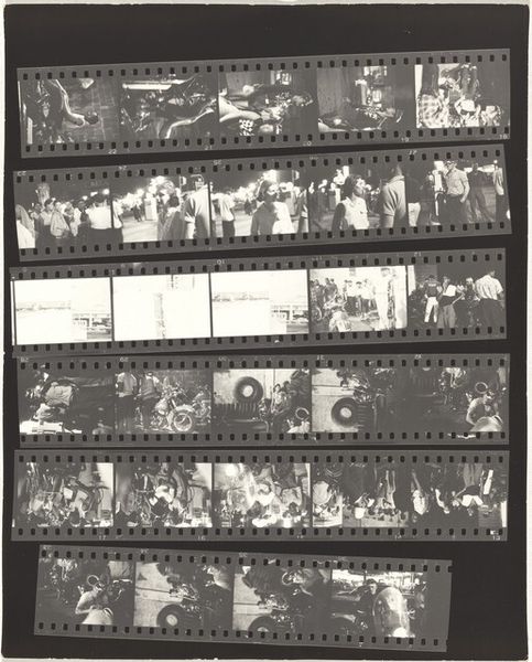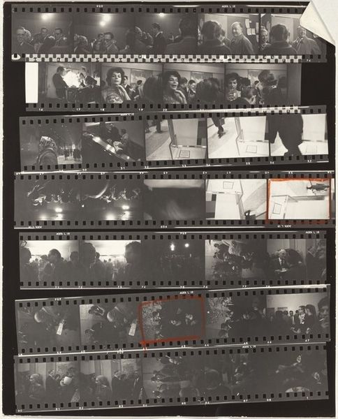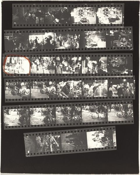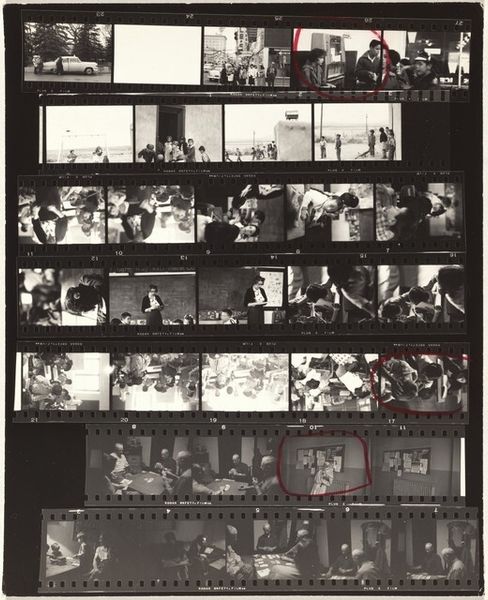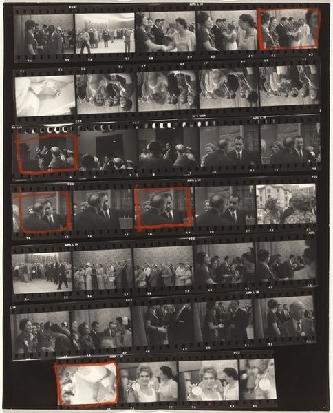 Robert Frank created this gelatin silver print, "Venice, Italy 16". At first glance, the arrangement of film strips presents a fragmented narrative, marked by an economy of means. The stark contrast of black and white lends a documentary feel, yet the red markings disrupt any sense of straightforward representation. Frank’s visual language plays with the semiotics of photography itself. The film strip format, usually a means to an end, becomes the artwork's structural foundation. Consider how the framing of each shot directs your eye, only to be interrupted by the artist's own selections and annotations. These red markings act as signs, emphasizing certain images, and prompting us to question the photographer's intent and process. The interplay between the image's content and its presentation challenges traditional notions of photographic truth. Frank’s work embodies a broader dialogue about the photographer's role in shaping meaning. The artist invites us to consider how choices in framing, selection, and annotation influence the reception of an image, and ultimately, its power to communicate.