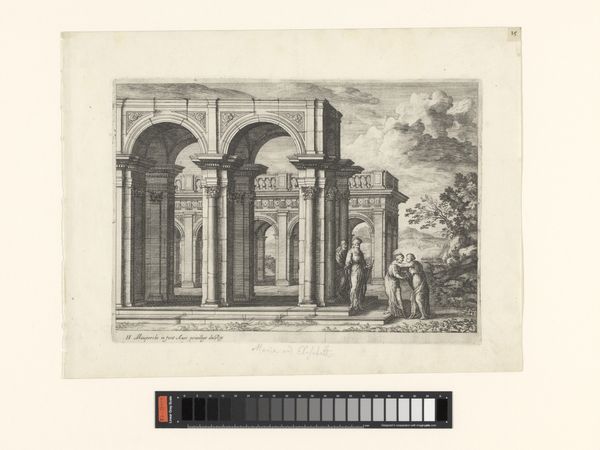 Editor: This is a print called "Annunciation," created between 1639 and 1656. It's by Henri Mauperché and resides in the Rijksmuseum collection. The figures almost seem caught within the architectural structure; a divine message brought to the human world, but still bound to earth, if that makes sense? What do you make of this engraving? Curator: An engraving such as this one presents a fascinating encapsulation of cultural memory surrounding the Annunciation. Notice how the angel descends on a cloud, almost dramatically bursting onto the scene within billowing, fiery clouds. Do you sense any emotional tension in this juxtaposition? Editor: Yes, I see what you mean; it’s like two worlds colliding, maybe. The calm stillness of the seated figure inside versus the kinetic energy of the angel and clouds… Curator: Precisely! The architectural setting becomes a symbolic container – representing societal order and established belief – literally housing the very irruption of the divine. And the act of *writing*, taking place in this constructed and man-made space. What is the effect of such opposition? Editor: Maybe that faith must constantly make itself known to exist, needing to disrupt the everyday to reinforce its meaning? Curator: Yes, the image implies an ongoing negotiation between the earthly and the divine, one that plays out within the framework of human creation and within societal perception and reception of images. I appreciate your thoughts. Editor: Thanks, I learned a lot by simply considering that opposition between inside/outside and divine/human. I will definitely approach engravings with new eyes now.