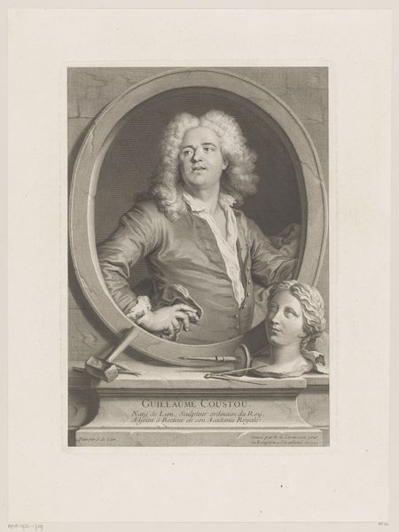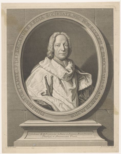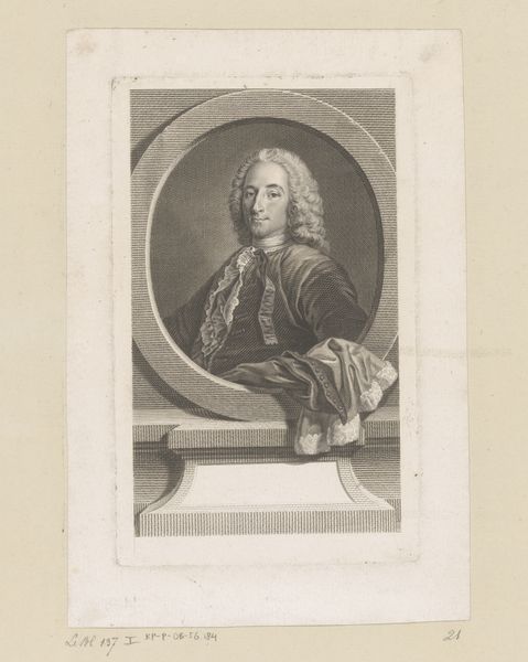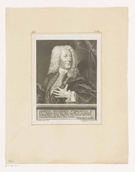 Curator: This is a rather striking portrait. John Faber II created this engraving in 1748, titling it "Portret van John Philipps." Editor: My initial response is one of somewhat detached authority. The sitter’s pose and the severe light cast a serious mood—a sense of absolute control—but something also feels subtly performative, doesn't it? Curator: Precisely. Faber masterfully utilizes the engraving technique, employing a dramatic baroque aesthetic to depict Philipps. Consider the careful etching; the hatching defines the subject’s form, bringing an imposing weight. Editor: But look closely—this weight, this authority, it's also carefully constructed. It is important to think about what this level of representation could mean in terms of both individual and political identity during this era. Notice the emphasis on attire: a symbol of belonging to a privileged social strata, or what it might have meant to portray oneself as a gentleman in a time of rapidly shifting political ideologies. Curator: Indeed, his garments indicate his social rank. And it’s worth noting how Faber's decision to foreground detail draws attention to the man's physical presence. The cascade of his wig, the slight shine on his jacket...it's a detailed exercise in visibility. Editor: Right, visibility—who gets to be seen, and how? That piercing gaze seems designed to solicit your immediate submission. Also, I keep coming back to that pointed finger: at whom, or at what, is this man directing his ambition? It may give an interesting view into gender dynamics and performances of masculinity at the time. Curator: A question to contemplate! I do believe, that from a strictly aesthetic standpoint, it’s a remarkable showcase of engraving. The texture, the lighting—Faber really understood how to push the medium's possibilities. Editor: Absolutely. Understanding those formal choices only enriches our reading of it, especially once we think about art’s function in shaping not only perception but power itself. Thanks for offering such helpful historical and artistic context, It will prompt further research for sure.
