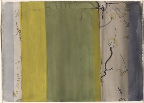Editor: Here we have Paul Klee’s "Composition with Figures" from 1915, a mixed-media piece using watercolor and coloured pencil. The composition seems to be broken up into blocks of color, and there are very rudimentary figures sketched into them. What’s striking is the contrast between the almost childlike rendering of the figures and the complex, layered abstraction. What do you make of it? Curator: Well, I think it is important to understand the environment from which it comes, namely, World War I. I see the fracturing you mentioned as potentially reflective of that era’s fractured social landscape and a crisis in representation itself. How can one create art that reflects what is happening, when language is almost inadequate? Consider, too, the rise of Expressionism and Cubism during this time. Does it feel as if Klee is perhaps working in conversation with either of these styles? Editor: Absolutely. I see elements of both! There's the emotional intensity of Expressionism and the breaking down of form reminiscent of Cubism. Curator: Precisely. The piece actively engages with the sociopolitical currents that redefined artistic expression, a kind of deliberate move against academic norms of beauty and order. Art became a space where one could deal with chaos by creating something that wasn’t literal but expressed an emotional and perhaps, political truth. Do you think the naivete might belie deeper political statements? Editor: I never thought of it that way, but the intentional subversion of artistic expectations feels pretty radical in that context. So the form mirrors the societal upheaval…it’s fascinating to consider art as a reaction to the political atmosphere. Curator: Exactly! These are not just aesthetic choices. By understanding this context, the painting transforms from a simple composition to a profound reflection on a world in turmoil. Editor: Wow, that's really changed how I see this piece! Thanks!