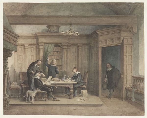 Edwin Austin Abbey created this watercolour entitled, "In Church." The composition is anchored by a juxtaposition of the living and the memorialized: two figures seated in a pew, contrasted against an elaborate tomb. A study in muted tones, the watercolour relies on subtle gradations of colour to define form. Light filters through the window, casting soft shadows that delineate the architectural space. Abbey plays with spatial organization, positioning the pew and tomb in a manner that invites the viewer to contemplate themes of mortality and memory. The figures in the pew are rendered with enough detail to suggest individuality, yet their presence remains secondary to the imposing tomb, drawing attention to the cyclical nature of life and art's capacity to immortalize. Abbey uses watercolours to reflect on time, memory, and the ever-present dialogue between the past and the present.