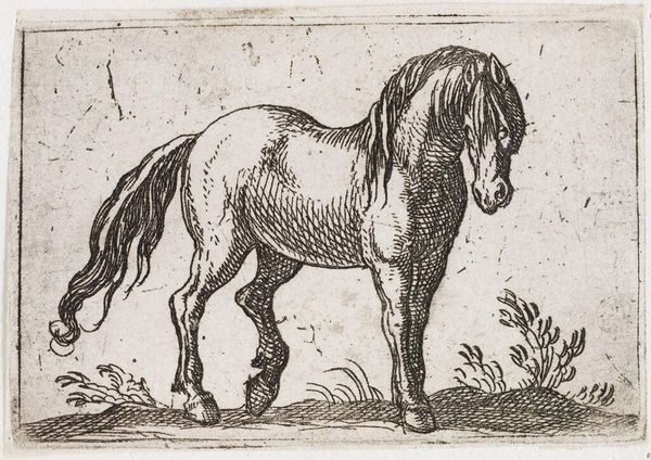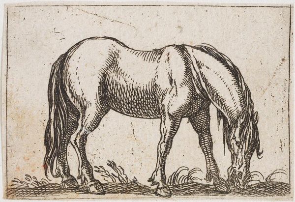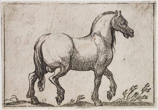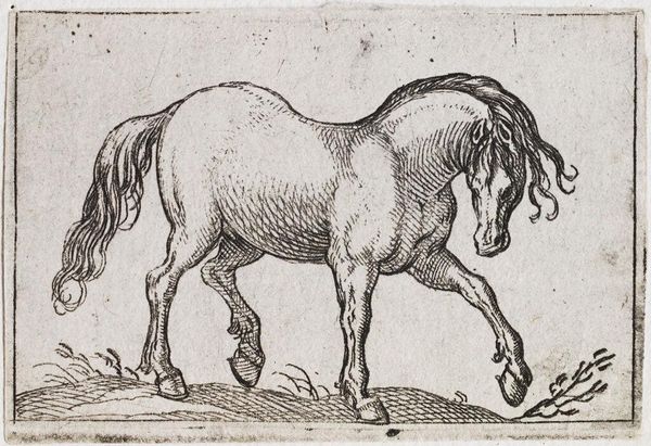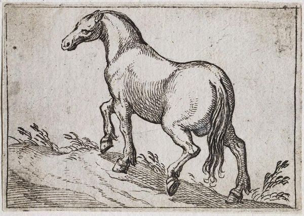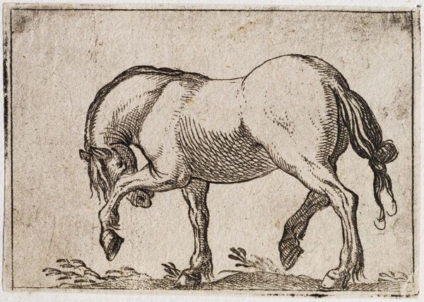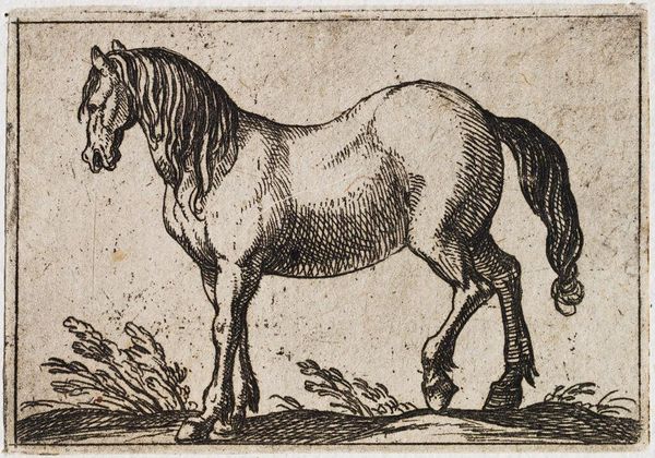 Editor: Here we have Antonio Tempesta’s “Standing Horse Viewed at a Three Quarter Angle,” from the Harvard Art Museums. It’s a lovely, small print. What strikes me is the detail of the etching and how it conveys such a powerful animal. What do you see in this piece? Curator: Tempesta's image reflects the societal role of horses in the late 16th and early 17th centuries. Consider the audience: likely wealthy landowners and military leaders. How does the horse's posture convey status and power to them, shaping their understanding of authority? Editor: So, the horse isn’t just a horse; it’s a symbol of something larger. Curator: Precisely! Images like this played a crucial role in shaping perceptions of power and class within early modern European society. Editor: I hadn't thought about the social context influencing how people viewed even animal portraits. Thanks!