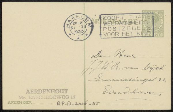 This Briefkaart aan Willem Bogtman was created in 1926 by Richard Nicolaüs Roland Holst, and is made of paper, ink, and a stamp. The postcard itself, a relatively new technology at the time, enabled cheap and fast communication, becoming a ubiquitous form of mass communication, a small canvas for personal and public expression. The processes of mass production involved in the creation of this postcard speak to a growing culture of consumption and connectivity in the early 20th century. The handwritten text becomes particularly significant, adding a personal, intimate touch to the mass produced object. The tactile quality of the handwriting contrasts with the standardized format of the postcard, highlighting the tension between individuality and mass culture. Consider the labor involved, from the postal workers to the manufacturers of the card, and the sender. Understanding the materials and modes of production helps us see this humble postcard as a poignant artifact, reflecting broader social and economic shifts of its time.