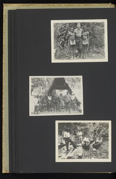 This photographic album sheet entitled 'Bezoek aan een dorp' or 'Visit to a Village' was made by an anonymous artist. There are so many contrasts here. The black and white palette really throws the tonal values into stark relief, and the process of photography feels very present. It's like a document, recording a specific moment in time and place. The texture is interesting too. The grain of the images give it a tactile quality, almost like you could run your fingers over the surface and feel the individual specks of light and shadow. I am drawn to the middle image of a village. The composition, with the people standing in front of the village in a group, feels formal and staged, but the contrast of light against the forest behind them makes it feel intimate at the same time. The work of someone like Gerhard Richter comes to mind, how he also used photography as a means to approach the art making. Ultimately, art is just an ongoing conversation, and this piece is just one voice in that chorus. It's up to us to listen and interpret it in our own way.