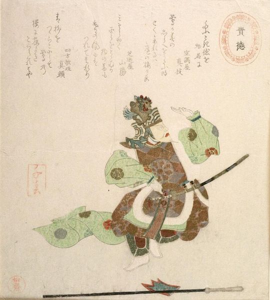 Editor: This is Yashima Gakutei's "Satsuma no Kami Tadanori," part of the series "Twenty-Four Generals for the Katsushika Circle." It's a Japanese woodblock print on paper. I'm struck by how this warrior is framed by the stark, leafless tree, contrasting the imagery of spring in the poem to the left. What historical context informs how we should view this piece? Curator: This print, like many Ukiyo-e works, reflects the rising merchant class's interest in samurai culture and its ideals. While ostensibly depicting Tadanori, a historical figure, its creation and consumption were deeply embedded in the social and cultural milieu of the Edo period. The inclusion of poetry alongside the warrior's image suggests a connection to the refined arts, a crucial aspect of samurai identity valorized by the merchant class. What is the public role of the warrior here? Editor: I see, so it's not just about the warrior himself, but about the values that society projected onto that image. Thank you, that gives me a different perspective. Curator: Indeed. The print functions as a cultural artifact, revealing how different social classes interacted with and reinterpreted historical narratives.