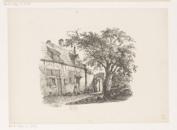 Jan Dam Steuerwald made this drawing, “Huizen naast een pad,” or "Houses Next to a Path," using graphite, likely in the mid-19th century. The image presents a cluster of rural buildings. Look at the textures Steuerwald achieved with just a pencil. He gives a palpable sense of the rough-hewn timbers, the thatched roofs, and the dirt path, illustrating them with subtle gradations of light and shadow. Consider the labor involved in maintaining these buildings. The thatch would need replacing; the wooden structures are carefully assembled. Even the dirt path has a constructed quality. This drawing isn't just a picturesque scene, it's a document of a working landscape. Ultimately, Steuerwald's choice of such a humble subject, and his close attention to its materiality, reminds us that everyday life is worthy of artistic consideration. It challenges us to see beauty and significance in the ordinary.
