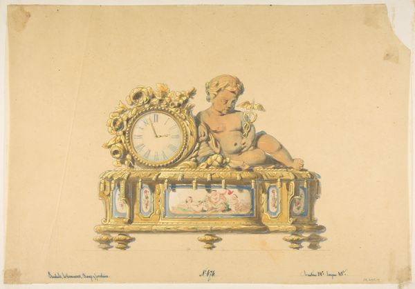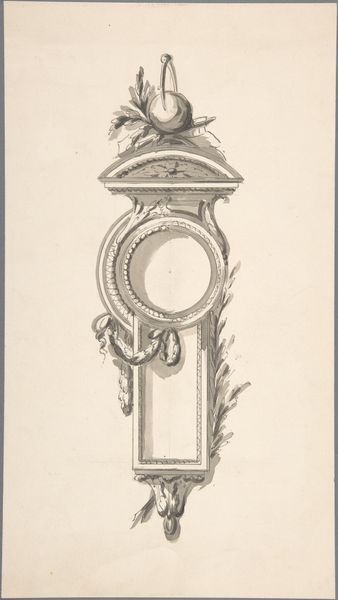 Editor: This is "Design for a Clock," a drawing made sometime between 1770 and 1785 by an anonymous artist. It looks like it’s done with print and drawing. The gold leaf and classical imagery feel really decadent. What can you tell me about its context? Curator: The abundance of classical motifs speaks volumes about the late 18th century’s fascination with antiquity. This clock, if realized, would have been a statement piece, reflecting the neoclassical style that dominated decorative arts at the time. It's interesting to note the political associations of Neoclassicism - its association with civic virtue and reason - adopted after the French Revolution to convey moral authority. Editor: So, it's not just about looking pretty, it's also about sending a message of power or virtue? Curator: Exactly. Luxury items weren't just about personal enjoyment. Objects like these clocks visually reinforced the status of their owners and propagated certain ideological messages throughout society. The very display of this clock in a home served a public role, showcasing wealth, taste, and an alignment with certain political ideals. Notice how this particular clock design is a synthesis between vertical, rectangular blocks and flowing decorations. Do you know what that refers to? Editor: I guess that's the tension between, like, reason and… fancy stuff? I see that! Curator: Precisely. The cultural elite controlled not just visual symbolism but also the techniques for architectural design. It really begs the question: who was this clock *for*? And what sociopolitical roles would such a clock play at the time? Editor: That makes me think about how even everyday objects can be charged with meaning. I won't look at a clock the same way! Curator: Agreed, it opens up many more perspectives.