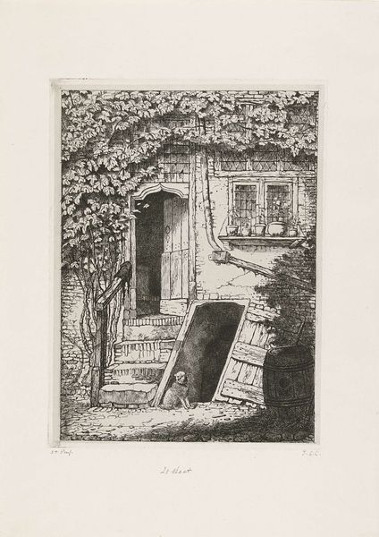 Curator: Let's turn our attention to "Waterput bij een muur" or "Well by a Wall", an etching by Jacobus Hermanus Otterbeek, made sometime between 1854 and 1902. It depicts, unsurprisingly, a well house nestled against a weathered stone wall. What springs to mind for you? Editor: The silence. It feels starkly quiet here. The scene, in all its simple composition, evokes an intense feeling of loneliness. The thatched roof seems like it's sighing under the weight of who-knows-what kind of weary tale. Curator: That solitude definitely resonates. And when we consider the printmaking process Otterbeek used, etching, a somewhat laborious and indirect method of creating an image. Each line is bitten into the metal with acid, it emphasizes a removal, rather than addition of medium. Editor: Absolutely! Thinking about the physical effort—the resistant ground, the deliberate acid baths—infuses it with the slow, persistent labor that the well itself implies. Each mark speaks volumes about craft and the making-of! You get this sense of honest, rural life captured so simply. It feels timeless. Curator: Otterbeek's realism anchors the scene firmly in his contemporary world, the textures, the shadows… there is so much detail in capturing these mundane, daily structures! The attention given elevates the work from a simple rendering to, dare I say, something deeply evocative. But how does genre painting function here? It’s an everyday thing to get water. Editor: Because that water matters! Who dug that well? Who laid those stones? The function is about more than liquid consumption: labor, trade, even architectural knowledge all contributed to this very place we see. It all combines here to produce social relations through the means of production. Curator: Hmm. Perhaps a tad utopian. It gives us a tangible, touchable echo from the past. To reflect that an everyday scene, rendered through deliberate, painstaking methods can open dialogues not only around craft, but experience as well as simply *being* human. Editor: Perhaps. I simply ask myself what made that particular image appear and materialize, because that tells the truest story. Thanks to Otterbeek we both can keep digging further and deeper.