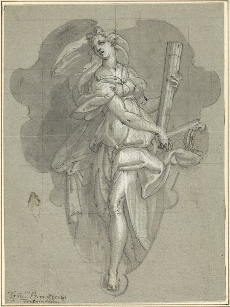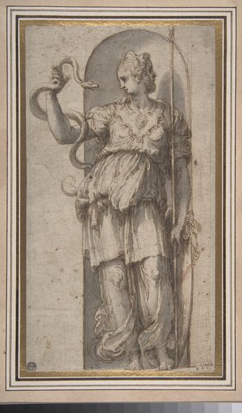 Editor: This is "Standing Figure of a Warrior King," a charcoal and pencil drawing by Cesare Nebbia, dating roughly between 1536 and 1614. The figure has a regal quality, but there's also a vulnerability in the rendering of the body. What do you see in this piece? Curator: It’s a compelling image. Looking through a critical lens, Nebbia's portrayal prompts me to consider the constructions of power and masculinity in the late Renaissance. Who was this "Warrior King" intended to represent, and how did that representation reflect, or perhaps challenge, prevailing social hierarchies? Editor: So it's not just a portrait, but potentially a statement? Curator: Exactly! Think about the role of art in shaping narratives around leadership, particularly male leadership. How are ideas about authority, strength, and even divinity being communicated, and whose voices are amplified or silenced in that process? Does his pose indicate dominance, or something else? And notice the technique – the softness of the charcoal. How does that affect our interpretation of strength? Editor: I see what you mean. The soft charcoal creates a sensitivity that complicates the image. Curator: Right, and considering this was likely a study, how does that change the power dynamics? Is it more subversive knowing it wasn't a final product commissioned by someone powerful? Editor: That’s a good point, maybe it reveals a personal contemplation by the artist. Curator: Precisely. Analyzing art through an activist lens asks us to excavate these layers of meaning and to interrogate the values they uphold, or subvert. Editor: It’s a completely different way to approach art history than I'm used to, I have to admit. It helps to ask more challenging questions. Curator: Absolutely, art is a dialogue.