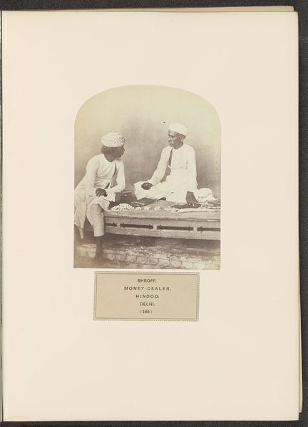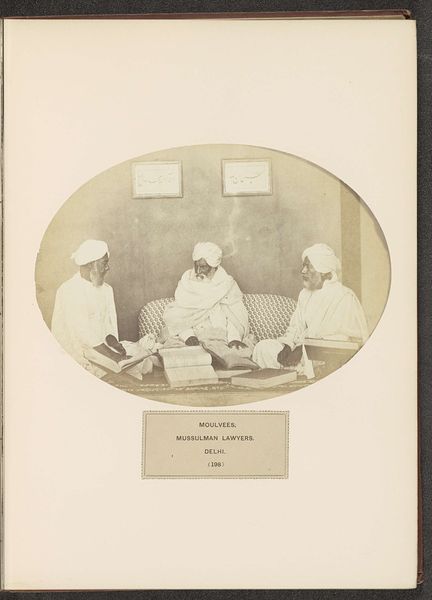 Curator: This is "Portrait of five landowners (zemindars) of Jat descent," a photographic print attributed to Shepherd & Robertson, dating from before 1874. It seems to be a fascinating example of early ethnographic photography. My immediate impression is how stark and composed it feels for such an early photograph. The tonal range in the print is also beautifully subtle. Editor: The composition certainly has a posed formality to it, but I'm curious about how it navigates representation and power. These Jat zemindars, as landowners, were undoubtedly figures of authority. How does photography here participate in maintaining or contesting that authority, especially within the colonial context? Curator: Well, photography, particularly portraiture, in the colonial context became a tool of documentation and often categorization. We can observe how their clothing, their postures, and the careful staging serve both to document them and to project an image that aligns with a certain Western understanding and control. Note the detailed attention paid to their attire and objects, hinting at their economic activities and status. Editor: Right, the choice of medium is significant. The materiality of a photographic print in the 19th century speaks to industrialization, global trade routes for materials, and its role in shaping perceptions of race, class, and culture, does it not? Curator: Precisely. The production of this image involved labor both visible and invisible, from the photographers in the studio to the subjects themselves. Editor: Absolutely. And it prompts a deeper reflection on labor, trade, and visibility during a period marked by global expansion and political upheaval. As for me, I find the entire dynamic of those gazes in the photograph telling of power structures beyond what’s immediately visible. Curator: Looking closely, the careful detailing of each individual within the group challenges simple generalization; but perhaps does it to other purposes we haven’t discussed? Editor: It's crucial to understand this piece within that network of coloniality, reminding us of its lasting implications in contemporary society. Thank you. Curator: Yes, and understanding that context underscores the work’s value as more than just an early example of photographic skill. It acts as a tangible document that complicates how we perceive both art and its complex past.