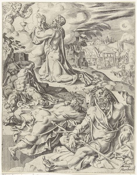 Curator: This is Simone Cantarini’s etching, "Saint Anthony of Padua adoring the Christ Child in Glory," created sometime between 1635 and 1645. The work employs the delicate strokes typical of baroque etching techniques. Editor: It strikes me as quite ethereal. There's an almost overwhelming abundance of cherubic figures, contrasting with the earthiness suggested by Saint Anthony's dark, simple robes. The sharp, directional lines pull my eye up the composition. Curator: The material conditions surrounding the making of etchings like this are quite interesting. Think about the economics of printmaking in 17th-century Italy. This wasn't a unique, one-off piece; it was made to be reproduced and distributed. What implications did this reproducibility have? Editor: Exactly. It highlights a tension present even today: access to art. Printmaking democratizes art, allowing wider audiences – including those of lower socio-economic classes – to engage with religious imagery, reinforcing ideological narratives. Curator: It's worth noting Cantarini's skills here. Etching is labour-intensive, and this level of detail required the skilled hands of artisans, revealing art's deep connection to craft. Look closely at how the lines define forms and create tonal variations. The etching process allows for the efficient production of these detailed designs, serving commercial functions alongside devotional ones. Editor: I’m struck by the gendered representation. The abundance of cherubs – mostly passive and childlike – and then St Anthony, whose piety is visualized in the devotion to Christ. Who consumes and who creates? In what ways does this dynamic reinforce traditional power structures? Curator: I think considering audience and intent is really helpful in interpreting such works. Did Cantarini create this for individual devotional use, or was it intended for wider circulation, and if so, how might the printing house that helped facilitate the distribution influence this? Editor: Those are crucial questions. Exploring beyond the pure aesthetic appreciation—asking, for instance, how images like these solidified notions of masculinity and devotion—offers critical insights into baroque society. Curator: It does remind us of the layered nature of art production, reminding us to look closely at its components – artistic skill, technical processes and distribution networks – rather than view it as purely divinely inspired. Editor: Agreed. Understanding that helps dismantle the romanticism surrounding the singular "genius" artist, directing our gaze toward collaborative contributions that give context to the final image, like the power of this work being available and reproducible during its time.