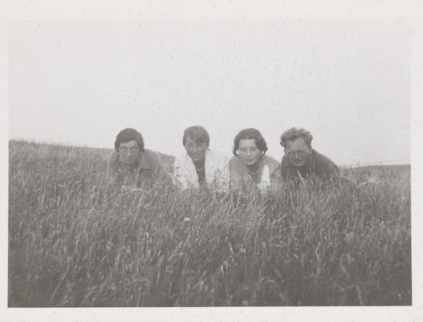 Curator: This striking black and white photograph, currently untitled, is by Tracey Moffatt. Editor: It feels… bleak. The composition, the greyscale, it all suggests a story of hardship. Curator: Moffatt is renowned for using constructed narratives within her photography. Note the staging, the placement of figures— pregnant woman, two other figures, a man holding a chicken. Editor: There's a definite sense of displacement, of being on the margins, the figures seem so vulnerable within this desolate landscape. The man looking up at the sky holding the chicken somehow feels like prayer. Curator: The tonal range is quite limited, isn't it? The stark contrast emphasizes the rough texture of the building and the figures, creating a sense of rawness. Editor: True, and it really amplifies the emotional impact. It's like she's stripped everything back to reveal a stark, brutal reality. Curator: It leaves you with a lot to think about. Editor: Absolutely, a powerful snapshot of something unspoken.