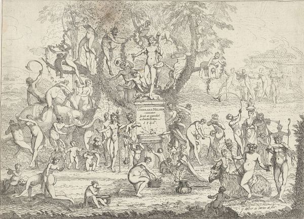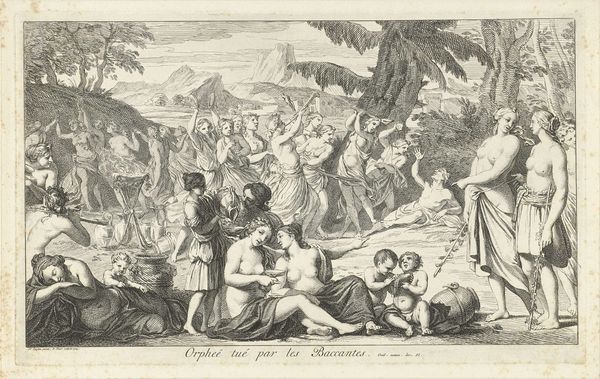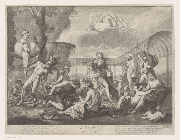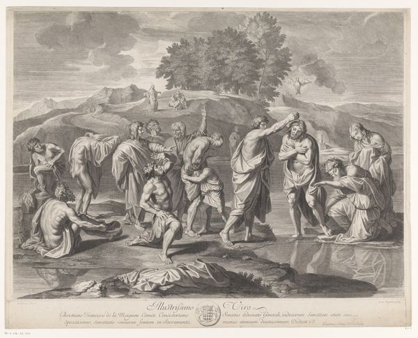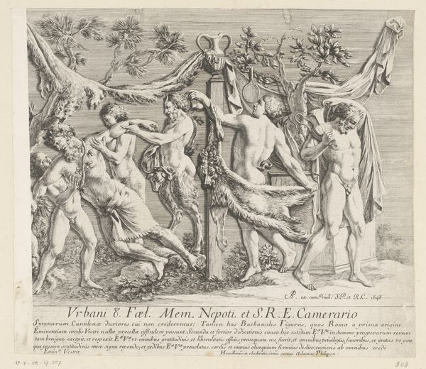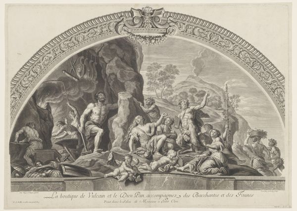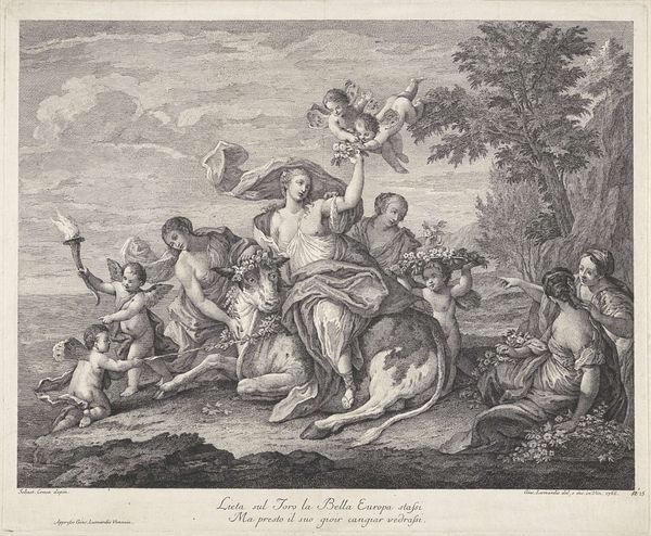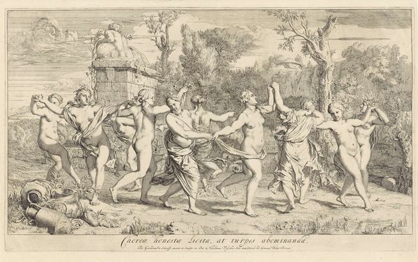 Andrea Procaccini created this etching, “Bacchus as a Child Given by Mercury to the Care of the Nymphs,” in the late 17th or early 18th century, a period when mythological subjects served as vehicles for exploring social and political ideas. The image shows Mercury entrusting the infant Bacchus to the nymphs, but it also speaks to the patronage system of the time. Made in Italy, the print reflects the cultural values of Baroque society, where wealthy patrons played a crucial role in supporting the arts. Procaccini dedicated this piece to two noblemen, Colmo and Pallavicino, and the act of bestowing Bacchus can be viewed as a metaphor for the patronage system itself. The nymphs embody the cultivated environment in which art and artists could flourish, thanks to the benevolence of wealthy benefactors. To understand this work more fully, we can consult historical records, letters, and other documents that shed light on the relationships between artists and patrons during this period.