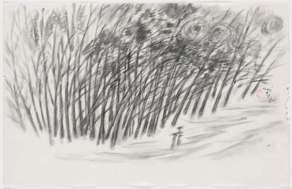 Curator: This is a print by Peter Doig, titled "From ‘Pond Life’," currently held in the Tate Collections. It's a small work, measuring just 172 by 280 millimeters. Editor: It evokes a quiet melancholy, almost isolation. The figures seem so small against that pale background. Curator: The lines used to define the figures and the skeletal trees are remarkably delicate, almost scratchy, hinting at the etching process. Editor: I’m intrigued by the social dynamics suggested here. The figures, their backs turned, seemingly disconnected from each other and the dilapidated building in the background. This print makes me consider themes of abandonment and social alienation. Curator: The artist’s choice of materials is critical. The monochromatic palette and the printmaking process add to the sense of starkness. Editor: It certainly prompts reflection on societal issues related to housing and community. Curator: Yes, a powerful, albeit understated, piece about place and presence. Editor: I agree, so much meaning in a small format.