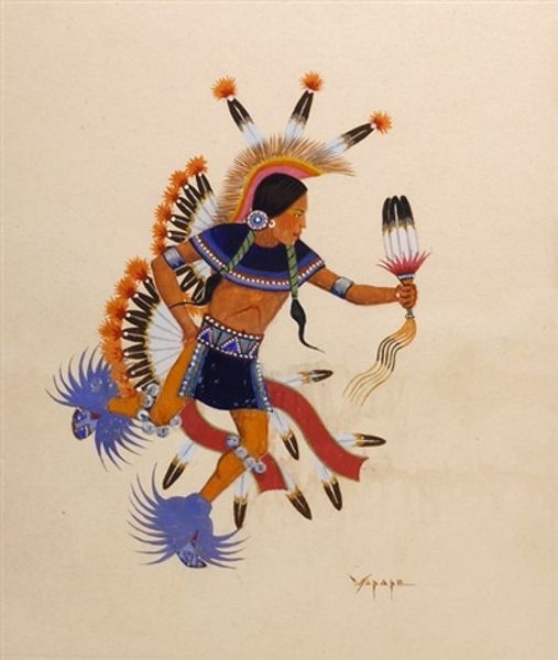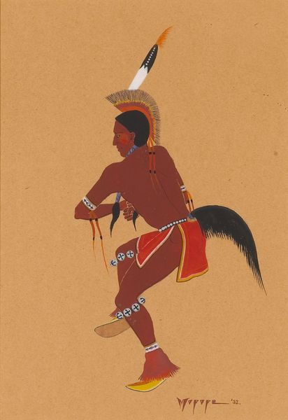 Stephen Mopope created this image of a 'Red Dancer' with watercolor and graphite. The dancer, adorned in vibrant red, carries a feathered fan and a decorated staff—symbols rich with meaning. We see the repeated motif of feathers, not just on the fan, but on his headpiece and as adornments on his limbs. Feathers, as a symbol, carry a deep resonance across cultures. From the wings of Hermes in classical antiquity, signifying speed and divine connection, to their use in indigenous cultures as symbols of prayer, peace and a connection to higher spirits. Notice how Mopope, while rooted in his cultural heritage, engages in a visual dialogue with broader human experiences. The feather, as a motif, transcends geographical and temporal boundaries, resurfacing in various forms, each time echoing humanity's yearning for transcendence. It connects us to the collective unconscious, where symbols are not static, but fluid, continuously evolving.