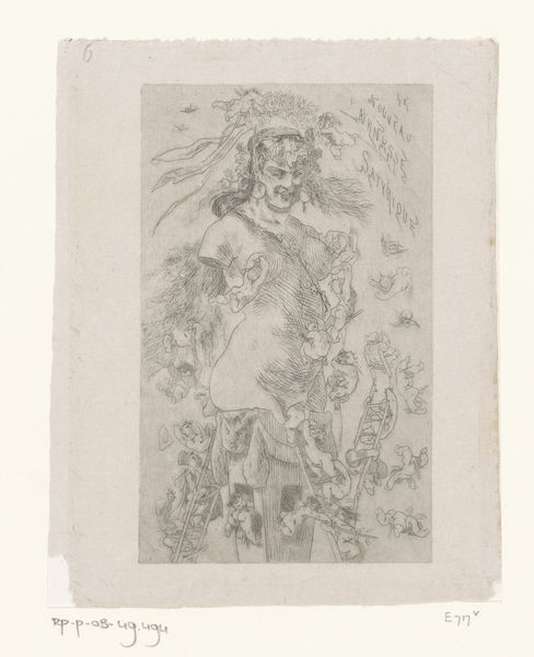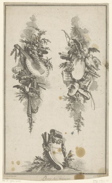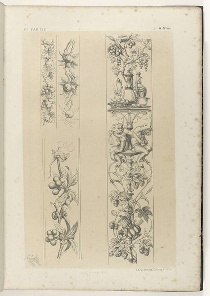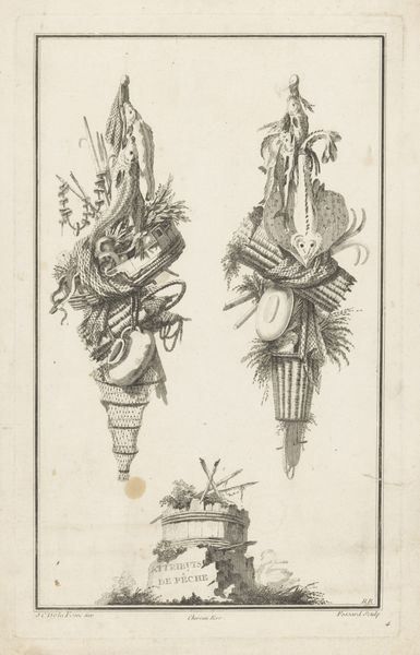 Michel Liénard created this linear drawing with precise draftsmanship; it depicts a plant stem alongside a trophy of fish and game. The artwork has a symmetrical composition, structured around two distinct vertical forms. On the left, the slender plant stem ascends with geometric exactitude, its leaves and blossoms arranged in a predictable, ordered sequence. Adjacent to it, the trophy on the right explodes with dynamic contrast, a baroque profusion of intertwined natural elements and man-made objects. Notice how Liénard uses the rigid structure of the stem to juxtapose the seemingly disorganized trophy. This can be interpreted through a semiotic lens: where the plant stem represents controlled natural order, the trophy embodies human intervention, where nature is subdued, collected, and displayed. The tension between organic and artificial, linear and curvilinear, invites us to deconstruct conventional notions of nature, artifice, and representation, making us question our understanding of the natural world.