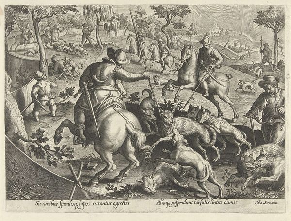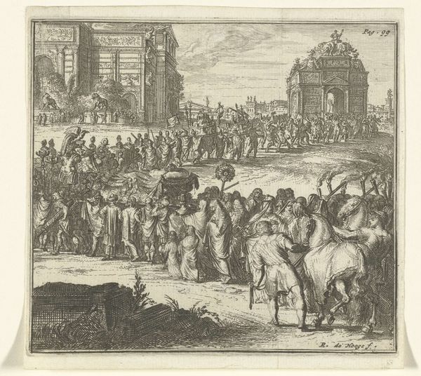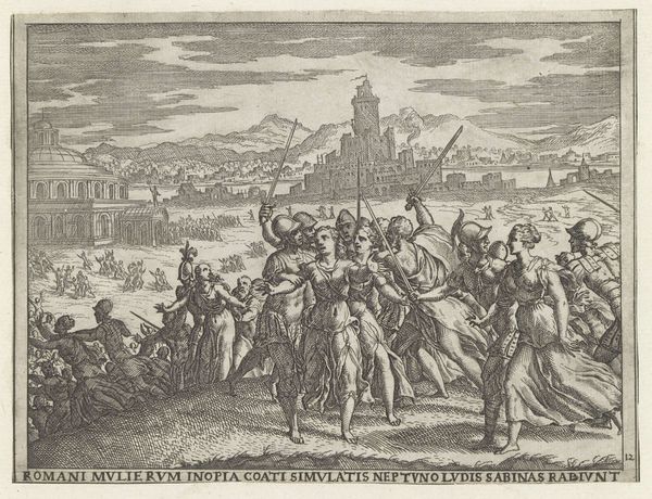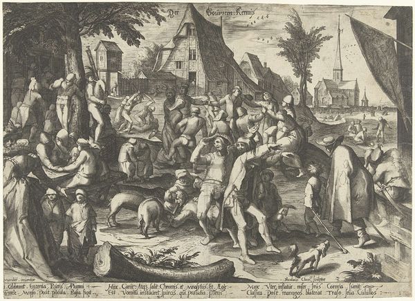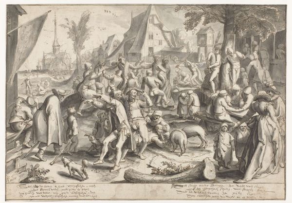 Pieter van der Borcht created this intricate village fair scene with an engraving. Immediately, your eye is drawn to the density of detail, a flurry of activity rendered in fine lines, creating texture that animates the whole composition. The composition seems chaotic at first, but the artist has carefully arranged the figures to guide our gaze. Notice how the foreground is filled with dancing peasants, their swirling motions creating a dynamic rhythm. This energy gradually dissipates as we move towards the background, where a more orderly procession leads into the distant village. This contrast isn’t accidental; it highlights the tension between the exuberance of the fair and the structured world beyond. Here, the artist uses line and form not just to depict a scene, but to explore the very structure of social life. The stark, linear quality of the engraving medium further emphasizes this interplay of order and disorder, inviting us to consider how such festive occasions both reflect and challenge the norms of society.