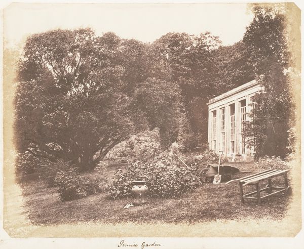 Editor: What strikes me immediately is the sense of profound stillness. An almost sepia-toned hush seems to blanket everything in these conjoined photographs. Curator: Precisely. What we are viewing here are two joined albumen prints created between 1853 and 1856 by James Knight, titled "Penllergare; Coedriglan." Knight was quite progressive; it's an early example of landscape photography demonstrating his plein-air approach. Editor: Progressive is right. The top image, presumably Penllergare, uses these heavily foliaged trees as framing devices, drawing our eye to a somewhat obscured building. I am intrigued by the artist's physical positioning and how that implicates issues of class, land and labor, as photography at that time could still be cumbersome, materially intense. What would be the effect and affective tone with each click of the shutter. Curator: I agree, there's an undeniable structured gaze in effect. Structurally, it’s about balance. The lower print, titled "Coedriglan", opens the view wider, shifting from enclosure to open expanse. The light, too, is handled exquisitely. The building is presented to us and the grounds become the primary figure. Editor: This is quite an exercise in the orchestration of tonal range with albumen. Think about the production - the albumen, likely sourced from a team, applied to paper, exposed with large plate negatives and all during such fragile social-economic times. And Knight seems rather sensitive to such nuances that would've determined material outcome. Curator: Indeed, considering Knight's position as both landowner and artist. Each carefully considered composition acts not just as a record but a claim, both visually and tangibly made evident with the silver halides and glass plate. These material conditions create a profound image. Editor: Yes, absolutely, with this method you’re acutely aware of every subtle curve and crinkle in the surface, as it becomes a vital record of environment and also a record of time's labor and Knight's hand in that endeavor. So powerful.