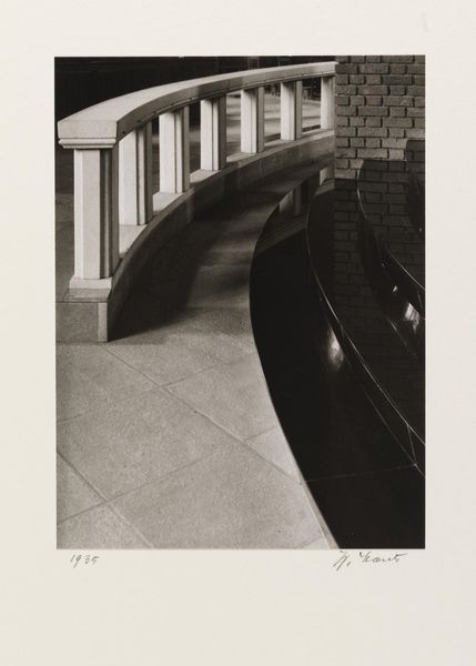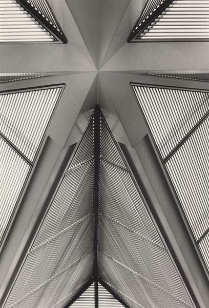 Editor: Here we have Franz Weiser's "Brücke (Bridge)" from 1930, a compelling black and white photograph. The geometric shapes create an interesting sense of depth and architectural might, though the monotone also feels a bit oppressive. What do you see in this piece? Curator: I see an intersection of human ambition and elemental forces, distilled into this almost gothic image. Notice how the bridge's arches echo classical forms, yet are built with industrial materials: steel, rivets, heavy support beams. Editor: So, like, progress clashing with tradition? Curator: It’s more complex than a simple clash, isn't it? Think of the bridge itself as a potent symbol. What does it connect? Physically, two points, maybe two disparate communities. But also, conceptually, it spans the gap between the old world and the new, doesn't it? What psychological burdens or promise does it carry as metaphor? Editor: Hmm, a symbol of hope to get to somewhere new but also a heavy burden of industrialization maybe? Curator: Precisely. This image becomes a marker of progress and perhaps even the dark weight of such construction on the collective psyche. And then, consider how Weiser framed the image... Do you find his particular choice of composition significant? Editor: I guess capturing it from underneath makes you feel the scale of it even more. Curator: Exactly. It reinforces that feeling of awe, doesn't it? It prompts us to ask ourselves, how will these choices in visual imagery represent the complex layering of memory in our culture moving forward? Editor: I hadn't thought about it like that! Seeing it as not just a bridge, but as a powerful symbol linking different times, gives it a whole new layer of meaning.